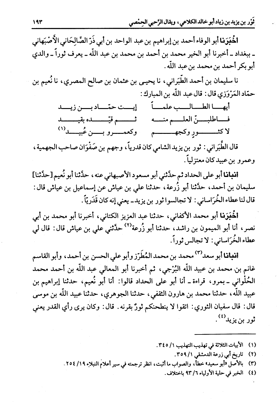 أخبرنا أبو الوفاء أحمد بن إبراهيم بن عبد الواحد بن أبي ذر الصالحاني الأصبهاني ببغداد أخبرنا أبو الخير محمد بن أحمد بن محمد بن عبد الله يعرف ثورا والدي أبو بكر أحمد بن محمد بن عبد الله نا سليمان بن أحمد بن الطبراني نا يحيى بن عثمان بن صالح المصري نا نعيم بن حماد المروزي قال قال عبد الله بن المبارك أيها الطالب علما * إيت حماد بن زيد فاطلبن العلم منه * ثم قيده بقيد لا كثور وكجهم * وكعمرو بن عبيد (1) قال الطبراني ثور بن يزيد الشامي كان قدريا وجهم بن صفوان صاحب الجهمية وعمرو بن عبيد كان معتزليا أنبانا أبو علي الحداد ثم حدثني أبو مسعود الأصبهاني عنه حدثنا أبو نعيم حدثنا سليمان بن أحمد حدثنا أبو زرعة حدثنا علي بن عياش عن إسماعيل بن عياش قال قال لنا عطاء الخراساني لا تجالسوا ثور بن يزيد يعني إنه كان قدريا أخبرنا أبو محمد الأكفاني حدثنا عبد العزيز الكتاني أخبرنا أبو محمد بن أبي نصر أنا أبو الميمون بن راشد حدثنا أبو زرعة (2) حدثني علي بن عياش قال قال لي عطاء الخراساني لا تجالسوا ثورا أنبانا أبو سعد (3) محمد بن محمد المطرز وأبو علي الحسن بن أحمد وأبو القاسم غانم بن محمد بن عبيد الله البرجي ثم أخبرنا أبو المعالي عبد الله بن أحمد محمد الحلواني بمرو قراءة أنا أبو على الحداد قالوا أنا أبو نعيم حدثنا إبراهيم بن عبيد الله حدثنا محمد بن هارون الثقفي حدثنا الجوهري حدثنا عبيد الله بن موسى قال قال سفيان الثوري اتقوا لا ينطحنكم ثور بقرنه قال وكان يرى رأي القدر يعني ثور بن يزيد (4)