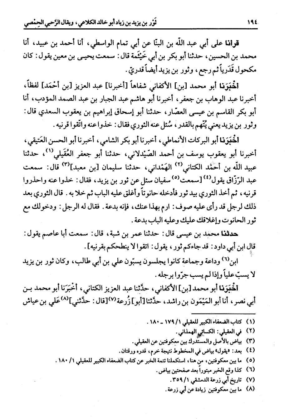 قرأنا على أبي عبد الله بن البنا عن أبي تمام الواسطي أنا احمد بن عبيد أنا محمد بن الحسين حدثنا أبو بكر بن أبي خيثمة قال سمعت يحيى بن معين يقول كان مكحول قدريا ثم رجع وثور بن يزيد أيضا قدري أخبرنا أبو محمد بن الأكفاني شفاها أخبرنا عبد العزيز بن أحمد لفظا أخبرنا عبد الوهاب بن جعفر أخبرنا أبو هاشم عبد الجبار بن عبد الصمد المؤدب أنا أبو بكر القاسم بن عيسى العصار حدثنا أبو إسحاق إبراهيم بن يعقوب السعدي قال وثور بن يزيد يعني يتهم بالقدر سئل عنه الثوري فقال خذوا عنه واتقوا قرني m أخبرنا أبو البركات الأنماطي أخبرنا أبو بكر الشامي أخبرنا أبو الحسن العتيقي أخبرنا أبو يعقوب يوسف بن أحمد الصيدلاني حدثنا أبو جعفر العقيلي (1) حدثنا عبيد الله بن أحمد الكتاني (2) الهمداني حدثنا سليمان بن معبد (3) قال سمعت عبد الرزاق يقول (4) سمعت (5) سفيان سئل عن ثور بن يزيد فقال خذوا عنه واحذروا قرينه ثم أخذ الثوري بيد ثور فأدخله حانوتا وأغلق عليه الباب ثم خلا به قال الثوري بعد ذلك لرجل قد رأى عليه صوف ارم بهذا عنك فإنه بدعة فقال له الرجل ودخولك مع ثور الحانوت وإغلاقك عليك وعليه الباب بدعة حدثنا محمد بن عيسى قال حدثنا عمر بن شبة قال سمعت أبا عاصم يقول قال ابن أبي داود قد جاءكم ثور يقول اتقوا لا نيطحكم بقرينة ابن (6) وداعة وجماعة كانوا يجلسون يسبون علي بن أبي طالب وكان ثور بن يزيد لا يسب عليا وإذا لم يسب جروا برجله أخبرنا أبو محمد بن الأكفاني حدثنا عبد العزيز الكتاني أخبرنا أبو محمد بن أبي نصر أنا أبو الميمون بن راشد حدثنا أبو زرعة (7) قال حدثني (8) علي بن عياش