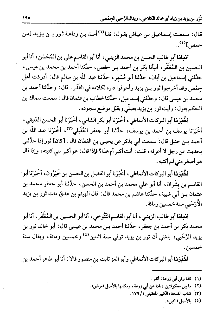 قال سمعت إسماعيل بن عياش يقول نفا (1) أسد بن وداعة ثور بن يزيد من حمص (2) أنبأنا أبو طالب الحسن بن محمد الزيني أنا أبو القاسم علي بن المحسن أنا أبو الحسين بن المظفر أنبأنا بكربن أحمد بن حفص حدثنا أحمد بن محمد بن عيسى حدثني إسماعيل بن أبان حدثنا أبو مسهر حدثنا عبد الله بن سالم قال أدركت أهل حمص وقد أخرجوا ثور بن يزيد وأحرقوا داره لكلامه في القدر قال وحدثنا أحمد بن محمد بن عيسى قال وحدثني إسماعيل حدثنا خطاب بن عثمان قال سمعت سماك بن الحكم يقول رأيت ثور بن يزيد يصلي ويقبل موضع سجوده أخبرنا أبو البركات الأنماطي أخبرنا أبو بكر الشامي أخبرنا أبو الحسن العتيقي أخبرنا يوسف بن أحمد بن يوسف حدثنا أبو جعفر العقيلي (3) أخبرنا عبد الله بن أحمد بن حنبل قال سمعت أبي يذكر عن يحيى بن القطان قال كان ثور إذا حدثني بحديث عن رجل لا أعرفه قلت أنت اكبر أم هذا فإذا قال هو أكبر مني كتبته وإذا قال هو أصغر مني لم أكتبه أخبرنا أبو البركات الأنماطي أخبرنا أبو الفضل بن الحسن بن خيرون أخبرنا أبو القاسم بن بشران أنا أبو علي محمد بن أحمد بن الحسن حدثنا أبو جعفر محمد بن عثمان بن ابي شيبة حدثنا هاشم بن محمد قال قال الهيثم بن عدي مات ثور بن يزيد الأرحبي سنة خمسين ومائة أنبانا أبو طالب الزينبي أنا أبو القاسم التنوخي أنا أبو الحسين بن المظفر أنا أبو محمد بكر بن أحمد بن جعفر حدثنا أحمد بن محمد بن عيسى قال أبو خالد ثور بن يزيد الرحبي بلغني أن ثور بن يزيد توفي سنة اثنتين وخمسين ومائة ويقال سنة خمسين أخبرنا أبو البركات الأنماطي وأبو العز ثابت بن منصور قالا أنا أبو طاهر أحمد بن