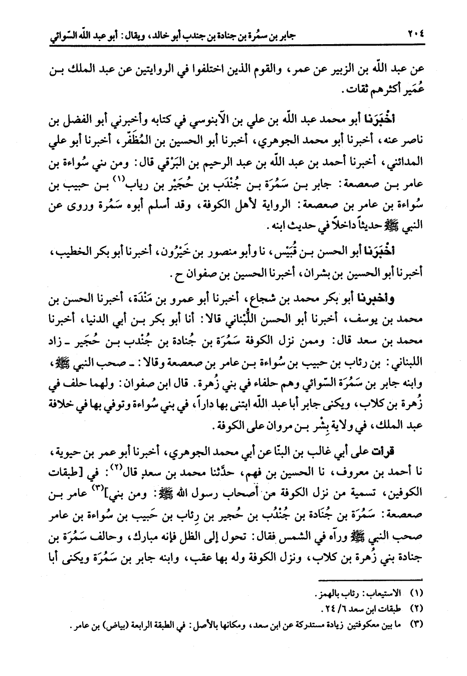 عن عبد الله بن الزبير عن عمر والقوم الذين اختلفوا في الروايتين عن عبد الملك بن عمير أكثرهم ثقات أخبرنا أبو محمد عبد الله بن علي بن الآبنوسي في كتابه وأخبرني أبو الفضل بن ناصر عنه أخبرنا أبو محمد الجوهري أخبرنا أبو الحسين بن المظفر أخبرنا أبو علي المدائني اخبرنا أحمد بن عبد الله بن عبد الرحيم بن البرقي قال ومن بني سواءة بن عامر بن صعصعة جابر بن سمرة بن جندب بن حجير بن رياب (1) بن حبيب بن سواءة بن عامر بن صعصعة الرواية لأهل الكوفة وقد أسلم أبوه سمرة وروى عن النبي (صلى الله عليه وسلم) حديثا داخلا في حديث ابنه اخبرنا أبو الحسن بن قبيس نا وأبو منصور بن خيرون أخبرنا أبو بكر الخطيب أخبرنا أبو الحسين بن بشران أخبرنا الحسين بن صفوان ح وأخبرنا أبو بكر محمد بن شجاع أخبرنا أبو عمرو بن مندة اخبرنا الحسن بن محمد بن يوسف أخبرنا أبو الحسن اللبناني قالا أنا أبو بكر بن أبي الدنيا أخبرنا محمد بن سعد قال وممن نزل الكوفة سمرة بن جنادة بن جندب بن حجير زاد اللبناني بن رئاب بن حبيب بن سواءة بن عامر بن صعصعة وقالا صحب النبي (صلى الله عليه وسلم) وابنه جابر بن سمرة السوائي وهم حلفاء في بني زهرة قال ابن صفوان ولهما حلف في زهرة بن كلاب ويكنى جابر أبا عبد الله ابتنى بها دارا في بني سواءة وتوفي بها في خلافة عبد الملك في ولاية بشر بن مروان على الكوفة قرأت على أبي غالب بن البنا عن أبي محمد الجوهري أخبرنا أبو عمر بن حيوية نا أحمد بن معروف نا الحسين بن فهم حدثنا محمد بن سعد قال (2) في طبقات الكوفين تسمية من نزل الكوفة من أصحاب رسول الله (صلى الله عليه وسلم) ومن بني (3) عامر بن صعصعة سمرة بن جنادة بن جندب بن حجير بن رئاب بن حبيب بن سواءة بن عامر صحب النبي (صلى الله عليه وسلم) ورآه في الشمس فقال تحول إلى الظل فإنه مبارك وحالف سمرة بن جنادة بني زهرة بن كلاب ونزل الكوفة وله بها عقب وابنه جابر بن سمرة ويكنى أبا