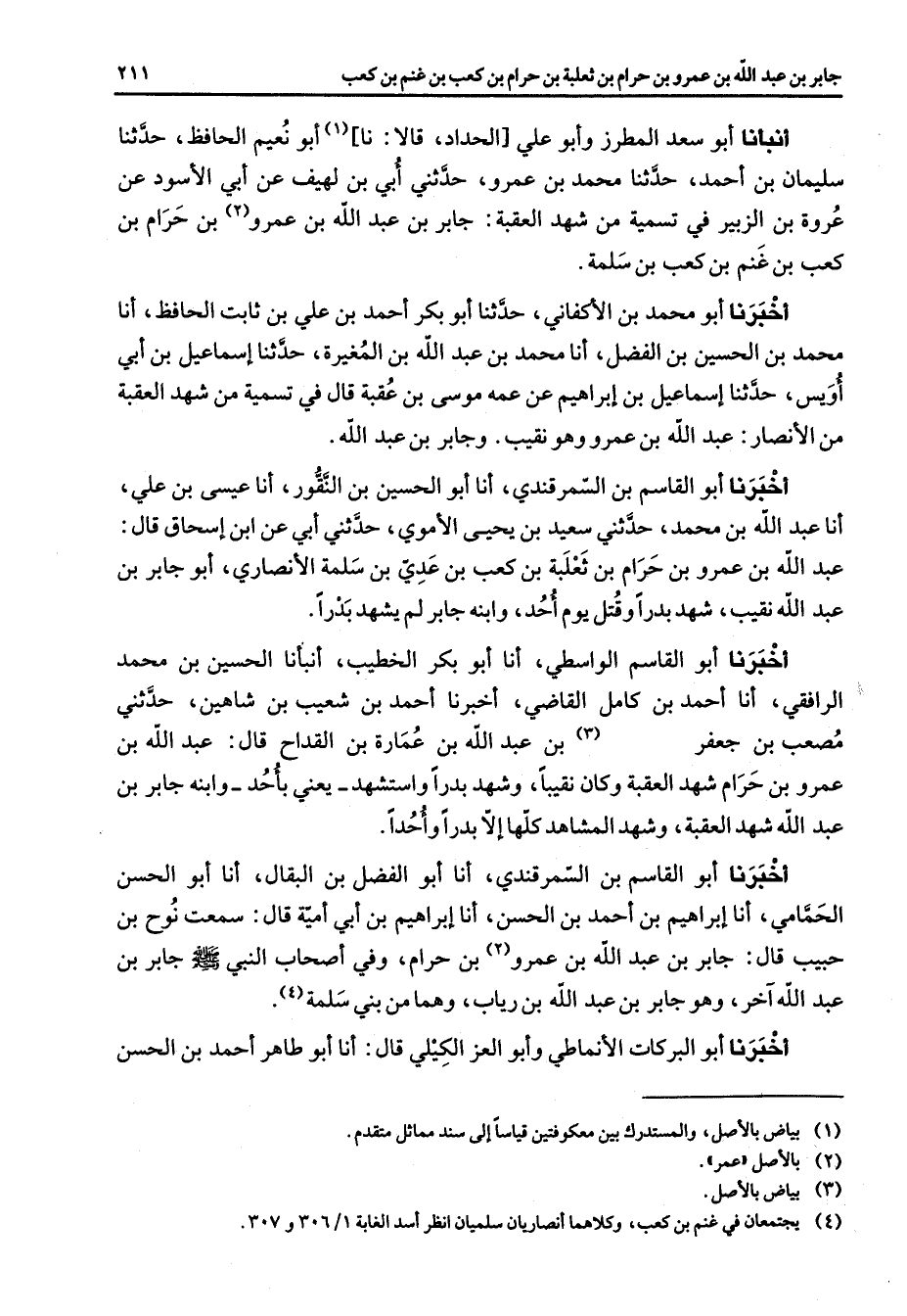أنبأنا أبو سعد المطرز وأبو علي الحداد قالا نا (1) أبو نعيم الحافظ حدثنا سليمان بن أحمد حدثنا محمد بن عمرو حدثني أبي بن لهيف عن أبي الأسود عن عروة بن الزبير في تسمية من شهد العقبة جابر بن عبد الله بن عمرو (2) بن حرام بن كعب بن غنم بن كعب بن سلمة أخبرنا أبو محمد بن الأكفاني حدثنا أبو بكر أحمد بن علي بن ثابت الحافظ أنا محمد بن الحسين بن الفضل أنا محمد بن عبد الله بن المغيرة حدثنا إسماعيل بن أبي أويس حدثنا إسماعيل بن إبراهيم عن عمه موسى بن عقبة قال في تسمية من شهد العقبة من الأنصار عبد الله بن عمرو وهو نقيب وجابر بن عبد الله أخبرنا أبو القاسم بن السمرقندي أنا أبو الحسين بن النقور أنا عيسى بن علي أنا عبد الله بن محمد حدثني سعيد بن يحيى الأموي حدثني أبي عن ابن إسحاق قال عبد الله بن عمرو بن حرام بن ثعلبة بن كعب بن عدي بن سلمة الأنصاري أبو جابر بن عبد الله نقيب شهد بدرا وقتل يوم أحد وابنه جابر لم يشهد بدرا أخبرنا أبو القاسم الواسطي أنا أبو بكر الخطيب أنبأنا الحسين بن محمد الرافقي أنا أحمد بن كامل القاضي أخبرنا أحمد بن شعيب بن شاهين حدثني مصعب بن جعفر (3) بن عبد الله بن عمارة بن القداح قال عبد الله بن عمرو بن حرام شهد العقبة وكان نقيبا وشهد بدرا واستشهد يعني بأحد وابنه جابر بن عبد الله شهد العقبة وشهد المشاهد كلها إلا بدرا واحدا اخبرنا أبو القاسم بن السمرقندي أنا أبو الفضل بن البقال أنا أبو الحسن الحمامي أنا إبراهيم بن أحمد بن الحسن أنا إبراهيم بن أبي أمية قال سمعت نوح بن حبيب قال جابر بن عبد الله بن عمرو (2) بن حرام وفي أصحاب النبي (صلى الله عليه وسلم) جابر بن عبد الله آخر وهو جابر بن عبد الله بن رياب وهما من بني سلمة (4) أخبرنا أبو البركات الأنماطي وأبو العز الكيلي قال أنا أبو طاهر أحمد بن الحسن
