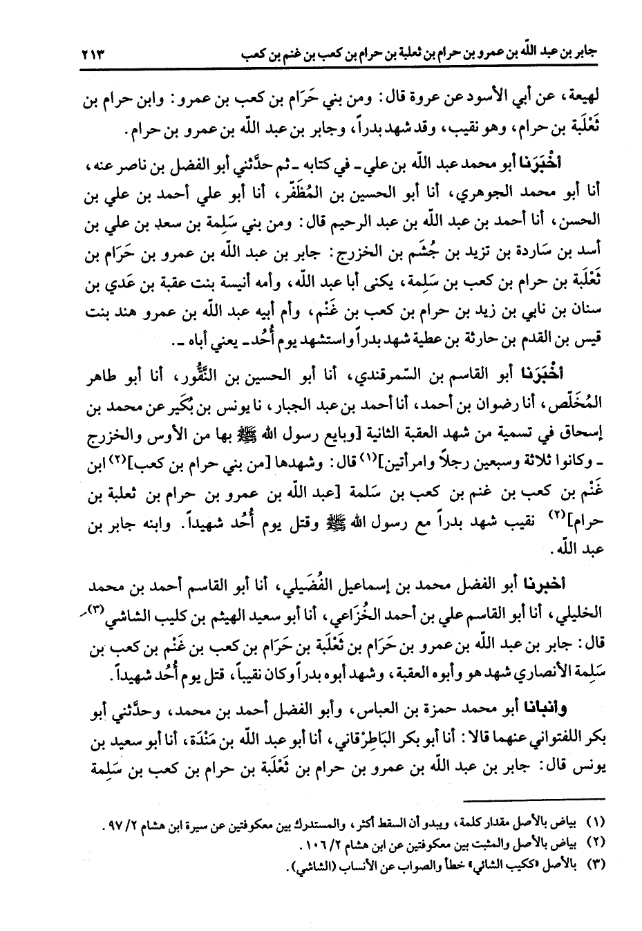 لهيعة عن أبي الأسود عن عروة قال ومن بني حرام بن كعب بن عمرو وابن حرام بن ثعلبة بن حراموهو نقيب وقد شهد بدرا وجابر بن عبد الله بن عمرو بن حرام أخبرنا أبو محمد عبد الله بن علي في كتابه ثم حدثني أبو الفضل بن ناصر عنه أنا أبو محمد الجوهري أنا أبو الحسين بن المظفر أنا أبو علي احمد بن علي بن الحسن أنا أحمد بن عبد الله بن عبد الرحيم قال ومن بني سلمة بن سعد بن علي بن أسد بن ساردة بن تزيد بن جشم بن الخزرج جابر بن عبد الله بن عمرو بن حرام بن ثعلبة بن حرام بن كعب بن سلمة يكنى أبا عبد الله وأمه أنيسة بنت عقبة بن عدي بن سنان بن نابي بن زيد بن حرام بن كعب بن غنم وأم أبيه عبد الله بن عمرو هند بنت قيس بن القدم بن حارثة بن عطية شهد بدرا واستشهد يوم أحد يعني أباه أخبرنا أبو القاسم بن السمرقندي أنا أبو الحسين بن النقور أنا أبو طاهر المخلص أنا رضوان بن أحمد أنا أحمد بن عبد الجبار نا يونس بن بكير عن محمد بن إسحاق في تسمية من شهد العقبة الثانية وبايع رسول الله (صلى الله عليه وسلم) بها من الأوس والخزرج وكانوا ثلاثة وسبعين رجلا وامرأتين (1) قال وشهدها من بني حرام بن كعب (2) ابن غنم بن كعب بن غنم بن كعب بن سلمة عبد الله بن عمرو بن حرام بن ثعلبة بن حرام (2) نقيب شهد بدرا مع رسول الله (صلى الله عليه وسلم) وقتل يوم أحد شهيدا وابنه جابر بن عبد الله أخبرنا أبو الفضل محمد بن إسماعيل الفضيلي أنا أبو القاسم أحمد بن محمد الخليلي أنا أبو القاسم علي بن أحمد الخزاعي أنا أبو سعيد الهيثم بن كليب الشاشي (3) قال جابر بن عبد الله بن عمرو بن حرام بن ثعلبة بن حرام بن كعب بن غنم بن كعب بن سلمة الأنصاري وشهد هو وأبوه العقبة وشهد أبوه بدرا وكان نقيبا قتل يوم أحد شهيدا وأنبأنا أبو محمد حمزة بن العباس وأبو الفضل أحمد بن محمد وحدثني أبو بكر اللفتواني عنهما قالا أنا أبو بكر الباطرقاني أنا أبو عبد الله بن مندة أنا أبو سعيد بن يونس قال جابر بن عبد الله بن عمرو بن حرام بن ثعلبة بن حرام بن كعب بن سلمة