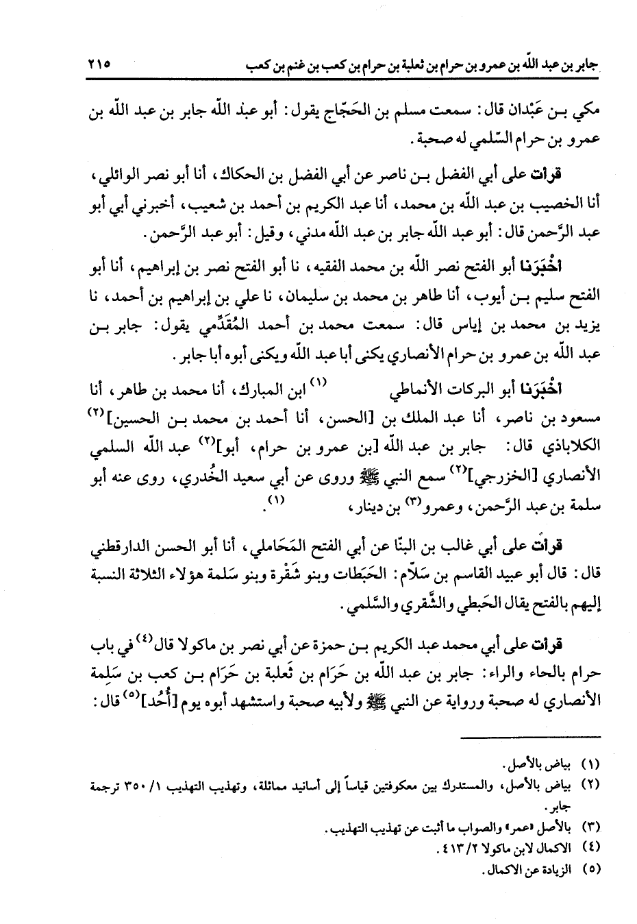 مكي بن عبدان قال سمعت مسلم بن الحجاج يقول أبو عبد الله جابر بن عبد الله بن عمرو بن حرام السلمي له صحبة قرأت على أبي الفضل بن ناصر عن أبي الفضا الضحاك الحكاك أنا أبو نصر الوائلي أنا الخصيب بن عبد الله بن محمد أنا عبد الكريم بن أحمد بن شعيب أخبرني أبي أبو عبد الرحمن قال أبو عبد الله جابر بن عبد الله مدني وقيل أبو عبد الرحمن أخبرنا أبو الفتح نصر الله بن محمد الفقيه نا أبو الفتح نصر بن إبراهيم أنا أبو الفتح سليم بن أيوب أنا طاهر بن محمد بن سليمان نا علي بن إبراهيم بن أحمد نا يزيد بن محمد بن إياس قال سمعت محمد بن أحمد المقدمي يقول جابر بن عبد الله بن عمرو بن حرام الأنصاري يكنى أبا عبد الله ويكنى أبوه أبا جابر أخبرنا أبو البركات الأنماطي (1) ابن المبارك أنا محمد بن طاهر أنا مسعود بن ناصر أنا عبد الملك بن الحسن أنا أحمد بن محمد بن الحسين (2) الكلاباذي قال جابر بن عبد الله بن عمرو بن حرام أبو (2) عبد الله السلمي الأنصاري الخزرجي (2) سمع النبي (صلى الله عليه وسلم) وروى عن أبي سعيد الخدري روى عنه أبو سلمة بن عبد الرحمن وعمرو (3) بن دينار (1) قرأت على أبي غالب بن البنا عن أبي الفتح المحاملي أنا أبو الحسن الدارقطني قال قال أبو عبيد القاسم بن سلام الحبطات وبنو شقرة وبنو سلمة هؤلاء الثلاثة النسبة إليهم بالفتح يقال الحبطي والشقري والسلمي قرأت على أبي محمد عبد الكريم بن حمزة عن أبي نصر بن ماكولا قال (4) في باب حرام بالحاء والراء جابر بن عبد الله بن حرام بن ثعلبة بن حرام بن كعب بن سلمة الأنصاري له صحبة ورواية عن النبي (صلى الله عليه وسلم) ولأبيه صحبة واستشهد أبوه يوم (5) أحد قال