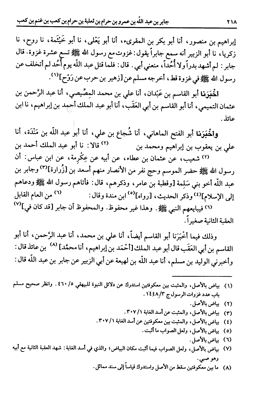إبراهيم بن منصور أنا أبو بكر بن المقرئ أنا أبو يعلى نا أبو خيثمة نا روح نا زكريا نا أبو الزبير أنه سمع جابرا يقول غزوت مع رسول الله (صلى الله عليه وسلم) تسع عشرة غزوة قال جابر لم أشهد بدرا ولا أحدا منعني أبي قال فلما قتل عبد الله يوم أحد لم أتخلف عن رسول الله (صلى الله عليه وسلم) في غزوة قط أخرجه مسلم عن زهير بن حرب عن روح (1) أخبرنا أبو القاسم بن عبدان أنا علي بن محمد المصيصي أنا عبد الرحمن بن عثمان التميمي أنا أبو القاسم بن أبي العقب أنا أبو عبد الملك أحمد بن إبراهيم نا ابن عائذ وأخبرنا أبو الفتح الماهاني أنا شجاع بن علي أنا أبو عبد الله من مندة أنا علي بن يعقوب بن إبراهيم ومحمد بن (2) قالا نا أبو عبد الملك أحمد بن (2) شعيب عن عثمان بن عطاء عن ابيه عن عكرمة عن ابن عباس أن رسول الله (صلى الله عليه وسلم) حضر الموسم وحج نفر من الأنصار منهم أسعد بن زرارة وجابر بن عبد الله أخو بني سلمة وقطبة بن عامر وذكرهم قال فأتاهم رسول الله (صلى الله عليه وسلم) ودعاهم إلى الإسلام (4) وذكر الحديث رواه (5) ابن مندة وقال (6) من العام القابل فيبايعهم النبي (صلى الله عليه وسلم) وهذا غير محفوظو المحفظوظ أن جابر قد كان في (7) العقبة الثانية صغيرا وذلك فيما أخبرنا أبو القاسم أيضا أنا علي بن محمد أنا عبد الرحمن أنا أبو القاسم بن أبي العقب قا أبو عبد الملك أحمد بن إبراهيم أنا محمد (8) بن عائذ قال وأخبرني الوليد بن مسلم أنا عبد الله بن لهيعة عن أبي الزبير عن جابر بن عبد الله قال