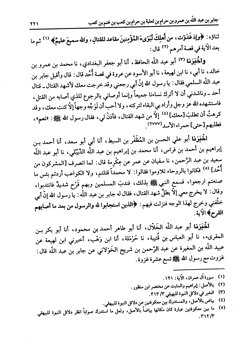 ثناؤه " وإذ غدوت من أهلك تبوئ المؤمنين مقاعد للقتال والله سميع عليم (1) " ثم ما بعد الآية في قصة أمرهم (2) قال وأخبرنا (3) أبو عبد الله الحافظ أنا أبو جعفر البغدادي نا محمد بن عمرو بن خالنا أبي نا ابن لهيعة نا أبو الأسود عن عروة في قصة أحد قال قال وأقبل جابر بن عبد الله السلمي فقال يا رسول الله إن أبي رجعني وقد خرجت معك لأشهد القتال قتال أحد وناشدني أن لا أترك نساءنا جميعا وإنما أوصاني بالرجوع للذي أصابه من القتل فاستشهده الله عز وجل وأراد بي البقاء لتركته ولا أحب أن توجه وجها إلا كنت معك وقد كرهت أن تطلب معك (4) إلا من شهد القتال فأذن لي فقال رسول الله (صلى الله عليه وسلم) نعم فطلبهم حتى حمراء الأسد