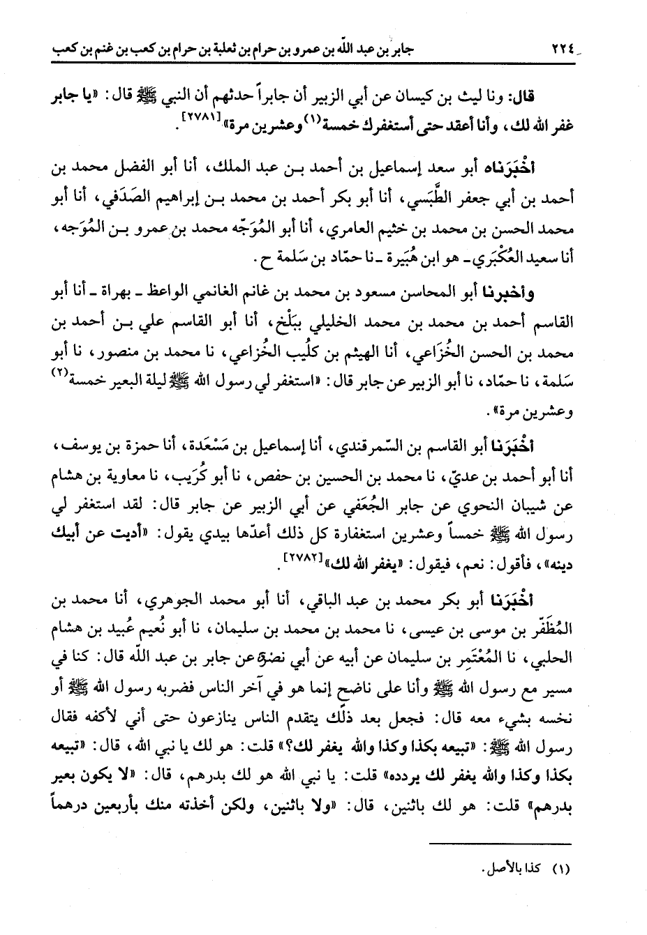 [2781] ح أخبرناه أبو سعد إسماعيل بن أحمد بن عبد الملك أنا أبو الفضل محمد بن أحمد بن أبي جعفر الطبسي أنا أبو بكر أحمد بن محمد بن إبراهيم الصدفي أنا أبو محمد الحسن بن محمد بن خثيم العامري أنا أبو الموجه محمد بن عمرو بن الموجه أنا سعيد العكبري هو ابن هبيرة نا حماد بن سلمة ح وأخبرنا أبو المحاسن مسعود بن محمد بن غانم الغانمي الواعظ بهراة أنا أبو القاسم أحمد بن محمد بن محمد الخليلي ببلخ أنا أبو القاسم علي بن أحمد بن محمد بن الحسن الخزاعي أنا الهيثم بن كليب الخزاعي نا محمد بن منصور نا أبو سلمة نا حماد نا أبو الزبير عن جابر قال استغفر لي رسول الله (صلى الله عليه وسلم) ليلة البعير خمسة وعشرين مرة أخبرنا أبو القاسم بن السمرقندي أنا إسماعيل بن مسعدة أنا حمزة بن يوسف أنا أبو أحمد بن عدي نا محمد بن الحسين بن حفص نا أبو كريب نا معاوية بن هشام عن شيبان النحوي عن جابر الجعفي عن أبي الزبير عن جابر قال لقد استغفر لي رسول الله (صلى الله عليه وسلم) خمسا وعشرين استغفارة كل ذلك أعدها بيدي يقول أديت عن ابيك دينه فأقول نعم فيقول يغفر الله لك