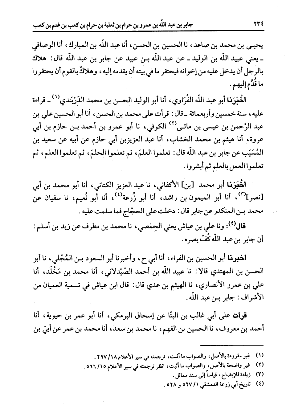 يحيى بن محمد بن صاعد نا الحسين بن الحسن أنا عبد الله بن المبارك أنك الوصافي يعني عبيد الله بن الوليد عن عبد الله بن عبيد عن جابر بن عبد الله قال هلاك بالرجل أن يدخل عليه من إخوانه فيحتقر ما في بيته أن يقدمه إليه وهلاك بالقوم أن يحتقروا ما قدم إليهم أخبرنا أبو عبد الله الفراوي أنا أبو الوليد الحسن بن محمد الدربندي (1) قراءة عليه سنة خمسين وأربعمائة قال قرأت على محمد بن الحسن أنا أبو الحسين علي بن عبد الرحمن بن عيسى بن ماتى (2) الكوفي نا أبو عمرو بن أحمد بن حازم بن أبي عروة أنا هيثم بن محمد الخشاب أنا عبد العزيز بن أبي حازم عن أبيه عن سعيد بن المسيب عن جابر بن عبد الله قال تعلموا العلم ثم تعلموا الحلم ثم تعلموا العلم ثم تعلموا العمل بالعلم ثم أبشروا أخبرنا أبو محمد بن الأكفاني نا عبد العزيز الكتاني أنا أبو محمد بن أبي نصر (3) أنا أبو الميمون بن راشد أنا أبو زرعة (4) أنا أبو نعيم نا سفيان عن محمد بن المنكدر عن جابر قال دخلت على الحجاج فما سلمت عليه قال (4) ونا علي بن عياش يعني الحمصي نا محمد بن مطرف عن زيد بن أسلم أن جابر بن عبد الله كف بصره أخبرنا أبو الحسين بن الفراء أنا أبي ح وأخبرنا أبو السعود بن المجلي نا أبو الحسن بن المهتدي قالا نا عبيد الله بن أحمد الصيدلاني أنا محمد بن مخلد أنا علي بن عمرو الأنصاري نا الهيثم بن عدي قال قال ابن عياش في تسمية العميان من الأشراف جابر بن عبد الله قرأت على أبي غالب بن البنا عن إسحاق البرمكي أنا أبو عمر بن حيوية أنا أحمد بن معروف نا الحسين بن الفهم نا محمد بن سعد أنا محمد بن عمر عن أبي بن