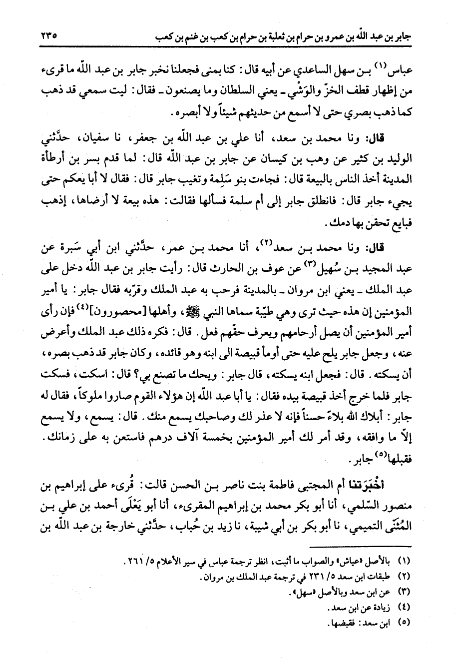عباس (1) بن سهل الساعدي عن أبيه قال كنا بمنى فجعلنا نخبر جابر بن عبد الله ما قرئ من إظهار قطف الخز والوشي يعني السلطان وما يصنعون فقال ليت سمعي قد ذهب كما ذهب بصري حتى لا أسمع من حديثهم شيئا ولا أبصره قال ونا محمد بن سعد أنا علي بن عبد الله بن جعفر نا سفيان حدثني الوليد بن كثير عن وهب بن كيسان عن جابر بن عبد الله قال لما قدم بسر بن أرطأة المدينة أخذ الناس بالبيعة قال فجاءت بنو سلمة وتغيب جابر قال فقال لا أبايعكم حتى