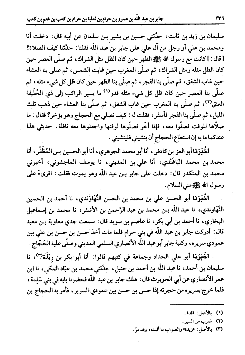 سليمان بن زيد بن ثابت حدثني حسين بن بشير بن سلمان عن أبيه قال دخلت أنا ومحمد بن علي أو رجل من آل علي على جابر بن عبد الله فقلنا حدثنا كيف الصلاة قال كانت مع رسول الله (صلى الله عليه وسلم) الظهر حين كان الظل مثل الشراك ثم صلى العصر حين كان الظل مثله ومثل الشراك ثم صلى المغرب حين غابت الشمس ثم صلى بنا العشاء حين غاب الشفق ثم صلى بنا الفجر ثم صلى بنا الظهر حين كان ظل كل شئ مثله ثم صلى بنا العصر حين كان ظل كل شئ مثله قدر (1) ما يسير الراكب إلى ذي الحليفة العنق (2) ثم صلى بنا المغرب حين غاب الشفق ثم صلى بنا العشاء حين ذهب ثلث الليل ثم صلى بنا الفجر فأسفر فقلت له كيف نصلي مع الحجاج وهو يؤخر فقال ما صلاها للوقت فصلوا معه فإذا أخر فصلوها لوقتها واجعلوها معه نافلة حديثي هذا عند كما ما به إن استطاع الحجاج أين ينشيني فلينشيني أخبرنا أبو العز بن كادش أنا أبو محمد الجوهري أنا أبو الحسين بن المظفر أنا محمد بن محمد الباغندي أنا علي بن المديني نا يوسف الماجشوني أخبرني محمد بن المنكدر قال دخلت على جابر بن عبد الله وهو يموت فقلت اقرئ على رسول الله (صلى الله عليه وسلم) مني السلام أخبرنا أبو الحسن علي بن محمد بن الحسن النهاوندي نا أحمد بن الحسين النهاوندي نا عبد الله بن محمد بن عبد الرحمن بن الأشقر نا محمد بن إسماعيل البخاري نا أحمد بن أبي بكر نا عاصم بن سويد قال سمعت جدي معاوية بن معبد قال أدركت جابر بن عبد الله في بني حرام فلما مات أخذ حسن بن حسن بن علي بين عمودي سريره وكنية جابر أبو عبد الله الأنصاري السلمي المديني وصلى عليه الحجاج أخبرنا أبو علي الحداد وجماعة في كتبهم قالوا أنا أبو بكر بن ريذة نا سليمان بن أحمد نا عبد الله بن أحمد بن حنبل حدثني محمد بن عباد المكي نا أبن عمر الأنصاري عن أبي الحويرث قال هلك جابر بن عبد الله فحضرنا بابه في بني سلمة فلما خرج بسريره من حجرته إذا حسن بن حسن بين عمودي السرير فأمر به الحجاج بن
