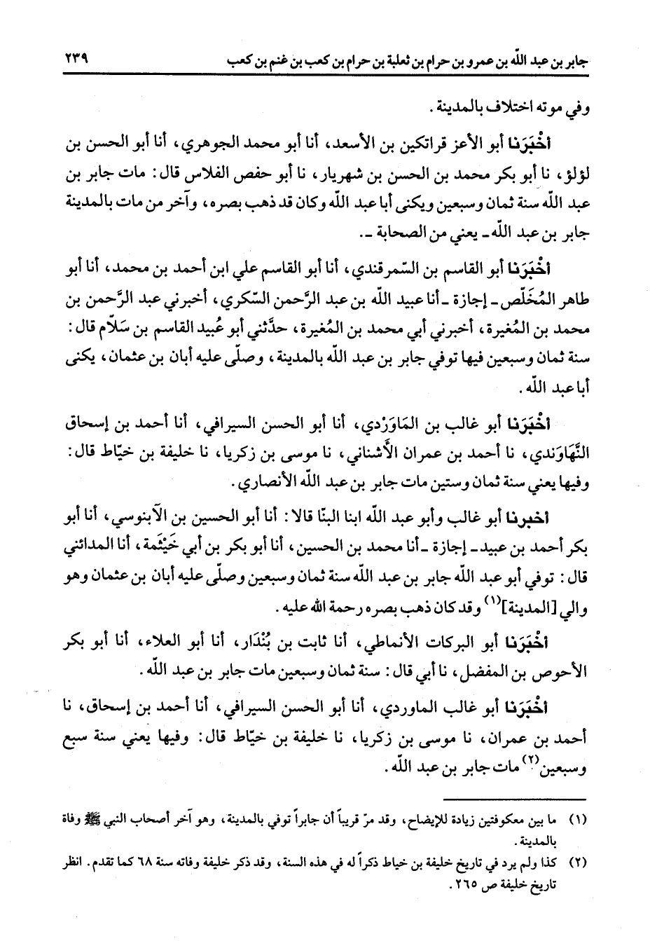 وفي موته اختلاف بالمدينة أخبرنا أبو الأعز قراتكين بن الأسعد أنا أبو محمد الجوهري أنا أبو الحسن بن لؤلؤ نا أبو بكر محمد بن الحسن بن شهريار نا أبو حفص الفلاس قال مات جابر بن عبد الله سنة ثمان وسبعين ويكنى أبا عبد الله وكان قد ذهب بصره وآخر من مات بالمدينة جابر بن عبد الله يعني من الصحابة أخبرنا أبو القاسم بن السمرقندي أنا أبو القاسم علي بن أحمد بن محمد أنا أبو طاهر المخلص إجازة أنا عبيد الله بن عبد الرحمن السكري أخبرني عبد الرحمن بن محمد بن المغيرة أخبرني أبي محمد بن المغيرة حدثني أبو عبيد القاسم بن سلام قال سنة ثمان وسبعين فيها توفي جابر بن عبد الله بالمدينة وصلى عليه أبان بن عثمان يكنى أبا عبد الله أخبرنا أبو غالب بن الماوردي أنا أبو الحسن السيرافي أنا أحمد بن إسحاق النهاوندي نا أحمد بن عمران الأشناني نا موسى بن زكريا نا خليفة بن خياط قال وفيها يعني سنة ثمان وستين مات جابر بن عبد الله الأنصاري أخبرنا أبو غالب وأبو عبد الله ابنا البنا قالا أنا أبو الحسين بن الآبنوسي أنا أبو بكر أحمد بن عبيد إجازة أنا محمد بن الحسين أنا أبو بكر بن أبي خيثمة أنا المدائني قال توفي أبو عبد الله جابر بن عبد الله سنة ثمان وسبعين وصلى عليه أبان بن عثمان وهو والي المدينة (1) وقد كان ذهب بصره رحمة الله عليه أخبرنا أبو البركات الأنماطي أنا ثابت بن بندار أنا أبو العلاء أنا أبو بكر الأحوص بن المفضل نا أبي قال سنة ثمان وسبعين مات جابر بن عبد الله أخبرنا أبو غالب الماوردي أنا أبو الحسن السيرافي أنا أحمد بن إسحاق نا أحمد بن عمران نا موسى بن زكريا نا خليفة بن خياط قال وفيها يعني سنة سبع وسبعين (3) مات جابر بن عبد الله