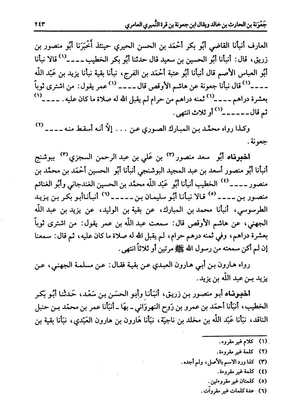 العارف أنبأنا القاضي أببكر أحمد بن الحسن الحيري حينئذ أخبرنا أبو منصور بن زريق قال أنبأنا أبو الحسين بن سعيد قال حدثنا أبو بكر الخطيب (1) قالا نبأنا أبو العباس الأصم قال أنبأنا أبو عتبة أحمد بن الفرج نبأنا بقية نبأنا يزيد بن عبد الله (1) قال نبأنا جعونة عن هاشم الأوقص قال (1) عمر يقول من اشترى ثوبا بعشرة دراهم ثمنه دراهم من حرام لم يقبل الله له صلاة ما كان عليه (1) ثم قال (1) أو ثلاث انتهى وكذا رواه محمد بن المبار ك الصوري عن إلا أنه سقط منه (2) جعونة أخبرناه أبو سعد منصور (3) بن علي بن عبد الرحمن السجزي (3) ببوشنج أنبأنا أبو منصور سعد بن عبد المجيد البوشنجي أنبأنا أبو الحسين أحمد بن محمد بن منصور (4) الخطيب أنبأنا أبو عبد الله محمد بن الحسين الغندجاني وأبو الغنائم منصور بن (5) قالا نبأنا أبو سليمان بن (6) أنبأنا أبو بكر بن يزيد الطرسوسي أنبأنا محمد بن المبارك عن بقية بن الوليد عن يزيد بن عبد الله الجهني عن هاشم الأوقص قال سمعت عبد الله بن عمر يقول من اشترى ثوبا بعشرة دراهم وفي ثمنه درهم حرام لم يقبل الله له صلاة ما كان عليه ثم قال سمعنا إن لم أكن سمعته من رسول الله (صلى الله عليه وسلم) مرتين أو ثلاثا انتهى رواه هارون بن أبي هارون العبدي عن بقية فقال عن مسلمة الجهني عن يزيد بن عبد الله بن يزيد أخبرناه أبو منصور بن زريق أنبأنا وأبو الحسن بن سعد حدثنا أبو بكر الخطيب أنبأنا أحمد بن عمرو بن روح النهرواني بها أنبأنا عمر بن محمد بن حنبل الناقد نبأنا عبد الله بن مخلد بن ناجية نبأنا هارون بن هارون العبدي نبأنا بقية بن