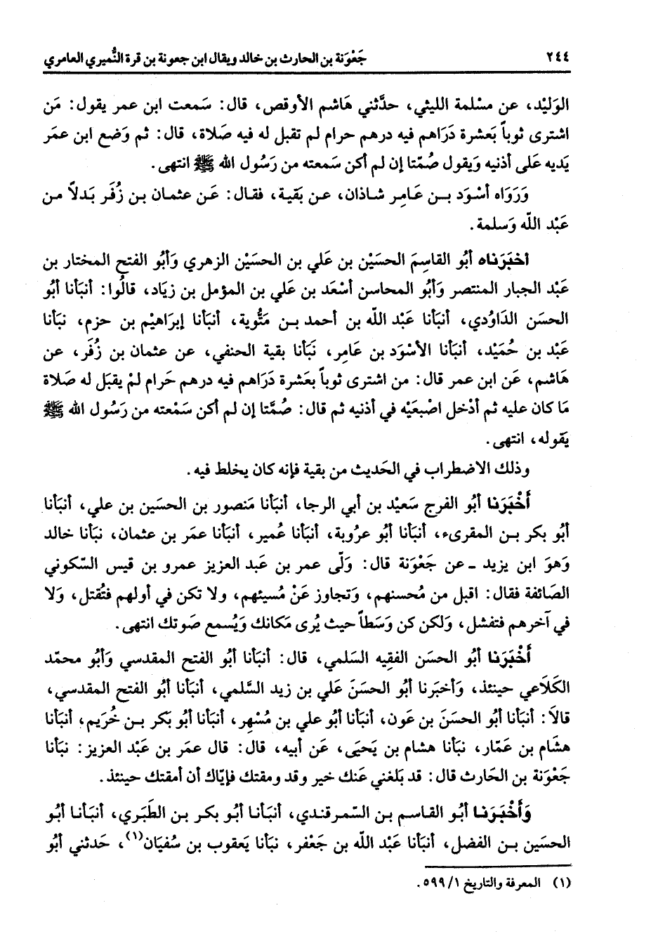 الوليد عن مسلمة الليثي حدثني هاشم الأوقص قال سمعت ابن عمر يقول من اشترى ثوبا بعشرة دراهم فيه درهم حرام لم تقبل له فيه صلاة قال ثم وضع ابن عمر يديه على أذنيه ويقول صمتا إن لم أكن سمعته من رسول الله (صلى الله عليه وسلم) انتهى ورواه أسود بن عامر شاذان عن بقية فقال عن عثمان بن زفر بدلا من عبد الله وسلمة أخبرناه أبو القاسم الحسين بن علي بن الحسين الزهري وأبو الفتح المختار بن عبد الجبار المنتصر وأبو المحاسن أسعد بن علي بن المؤمل بن زياد قالوا أنبأنا أبو الحسن الداودي أنبأنا عبد الله بن أحمد بن متوية أنبأنا إبراهيم بن حزم نبأنا عبد بن حميد أنبأنا الأسود بن عامر نبأنا بقية الحنفي عن عثمان بن زفر عن هاشم عن ابن عمر قال من اشترى ثوبا بعشرة دراهم فيه درهم حرام لم يقبل له صلاة ما كان عليه ثم أدخل اصبعيه في أذنيه ثم قال صمتا إن لم أكن سمعته من رسول الله (صلى الله عليه وسلم) يقوله انتهى وذلك الاضطراب في الحديث من بقية فإنه كان يخلط فيه أخبرنا أبو الفرج سعيد بن أبي الرجا أنبأنا منصور بن الحسين بن علي أنبأنا أبو بكر بن المقرئ أنبأنا أبو عروبة أنبأنا عمير أنبأنا عمر بن عثمان نبأنا خالد وهو ابن يزيد عن جعونة قال ولى عمر بن العزيز عمرو بن قيس السكوني الصائفة فقال اقبل من محسنهم وتجاوز عن مسيئهم ولا تكن في أولهم فتقتل ولا في آخرهم فتفشل ولكن كن وسطا حيث يرى مكانك ويسمع صوتك انتهى أخبرنا أبو الحسن الفقيه السلمي قال أنبأنا أبو الفتح المقدسي وأبو محمد الكلاعي حينئذ وأخبرنا أبو الحسن علي بن زيد السلمي أنبأنا أبو الفتح المقدسي قالا أنبأنا أبو الحسن بن عون أنبأنا أبو علي بن مسهر أنبأنا أبو بكر بن خريم أنبأنا هشام بن عمار نبأنا هشام بن يحيى عن أبيه قال قال عمر بن عبد العزيز نبأنا جعونة بن الحارث قال قد بلغني عنك خير وقد ومقتك فإياك أن أمقتك حينئذ وأخبرنا أبو القاسم بن السمرقندي أنبأنا أبو بكر بن الطبري أنبأنا أبو الحسين بن الفضل أنبأنا عبد الله بن جعفر نبأنا يعقوب بن سفيان (1) حدثني أبو