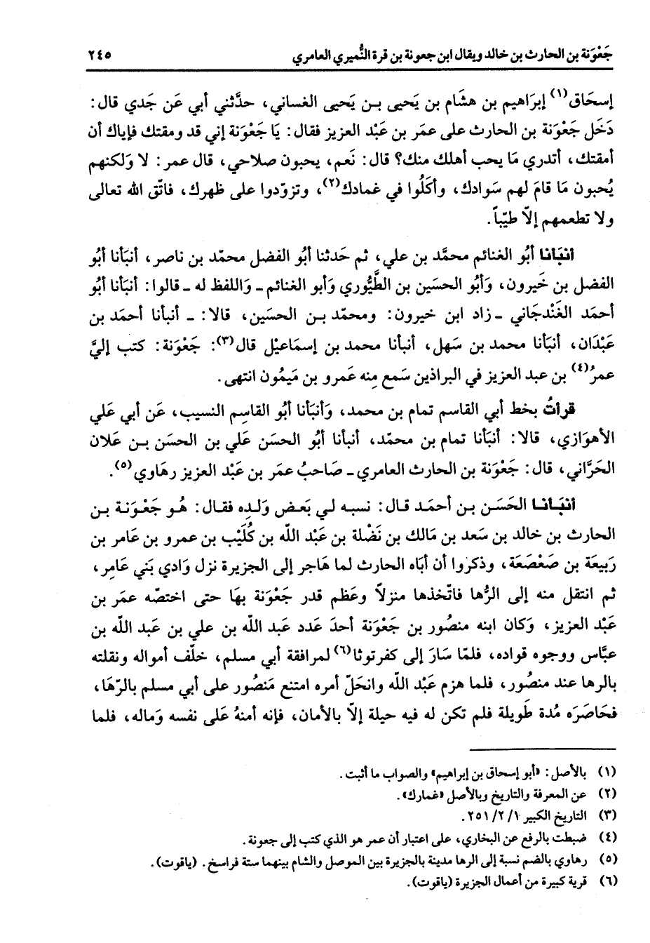إسحاق (1) إبراهيم بن هشام بن يحيى بن يحيى الغساني حدثني أبي عن جدي قال دخل جعونة بن الحارث على عمر بن عبد العزيز فقال يا جعونة إني قد ومقتك فإياك أن أمقتك أتدري ما يحب أهلك منك قال نعم يحبون صلاحي قال عمر لا ولكنهم يحبون ما قام لهم سوادك وأكلوا في غمادك (2) وتزودوا على ظهر ك فاتق الله تعالى ولا تطعمهم إلا طيبا أنبانا أبو الغنائم محمد بن علي ثم حدثنا أبو الفضل محمد بن ناصر أنبأنا أبو افضل بن خيرون وأبو الحسين بن الطيوري وأبو الغنائم واللفظ له قالوا أنبانا أبو أحمد الغندجاني زاد ابن خيرون ومحمد بن الحسين قالا أنبأنا أحمد بن عبدان أنبأنا محمد بن سهل أنبأنا محمد بن إسماعيل قال (3) جعونة كتب إلي عمر (4) بن عبد العزيز في البراذين سمع منه عمرو بن ميمون انتهى قرأت بخط أبي القاسم تمام بن محمد وأنبأنا أبو القاسم النسيب عن أبي علي الأهوازي قالا أنبأنا تمام بن محمد أنبأنا أبو الحسن علي بن الحسن بن علان الحراني قال جعونة بن الحارث العامري صاحب عمر بن عبد العزيز رهاوي (5) أنبأنا الحسن بن أحمد قال نسبة لي بعض ولده فقال هو جعونة بن الحارث بن خالد بن سعد بن مالك بن نضلة بن عبد الله بن كليب بن عمرو بن عامر بن ربيعة بن صعصعة وذكروا أن أباه الحارث لما هاجر إلى الجزيرة نزل وادي بني عامر ثم انتقل منه إلى الرها فاتخذها منزلا وعظم قدر جعونة بها حتى اختصه عمر بن عبد العزيز وكان ابنه منصور بن جعونة أحد عدد عبد الله بن علي بن عبد الله بن عباس ووجوه قواده فلما سار إلى كفرتوثا لمرافقة أبي مسلم خلف أمواله ونقلته بالرها عند منصور فما هزم عبد الله وانحل أمره امتنع منصور على أبي مسلم بالرها فحاصره مدة طويلة فلم تلكن له فيه حيلة إلا بالأمان فإنه أمنه على نفسه وماله فلما