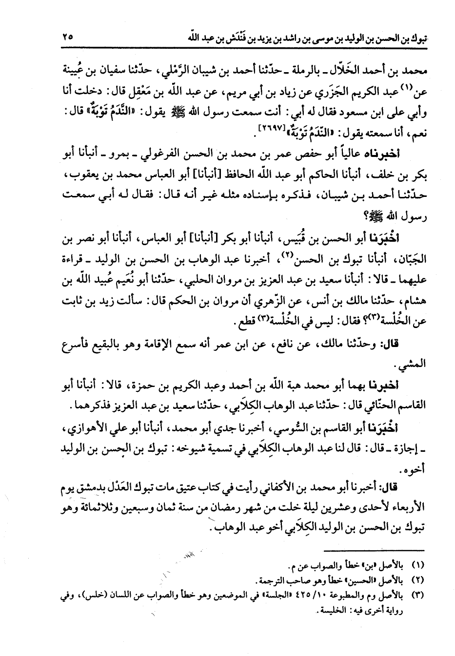 [2697] ح أخبرنا عاليا أبو حفص عمر بن محمد بن الحسن الفرغولي بمرو أنبأنا أبو بكر بن خلف أنبأنا الحاكم أبو عبد الله الحافظ أنبأنا أبو العباس محمد بن يعقوب حدثنا أحمد بن شيبان فذكره بإسناده مثله غير أنه قال فقال له أبي سمعت رسول الله (صلى الله عليه وسلم) أخبرناه أبو الحسن بن قبيس أنبأنا أبو بكر أنبأنا أبو العباس أنبأنا أبو نصر بن الجبان أنبأنا تبوك بن الحسن (2) أخبرنا عبد الوهاب بن الحسن بن الوليد قراءة عليهما قالا أنبأنا سعيد بن عبد العزيز بن مروان الحلبي حدثنا أبو نعيم عبيد الله بن هشام حدثنا مالك بن أنس عن الزهري أن مروان بن الحكم قال سألت زيد بن ثابت عن الخلسة (3) فقال ليس في الخلسة (4) قطع قال وحدثنا مالك عن نافع عن ابن عمر أنه سمع الإقامة وهو بالبقيع فأسرع المشي أخبرنا بهما أبو محمد هبة الله بن أحمد وعبد الكريم بن حمزة قالا أنبأنا أبو القاسم الحنائي قال حدثنا عبد الوهاب الكلابي حدثنا سعيد بن عبد العزيز فذكرهما أخبرنا أبو القاسم بن السوسي أخبرنا جدي أبو محمد أنبأنا أبو علي الأهوازي إجازة قال قال لنا عبد الوهاب الكلابي في تسمية شيوخه تبوك بن الحسن بن الوليد أخوه قال أخبرنا أبو محمد بن الأكفاني رأيت في كتاب عتيق مات تبوك العدل بدمشق يوم الأربعاء لأحدى وعشرين ليلة خلت من شهر رمضان من سنة ثمان وسبعين وثلاثمائة وهو تبوك بن الحسن بن الوليد الكلابي أخو عبد الوهاب