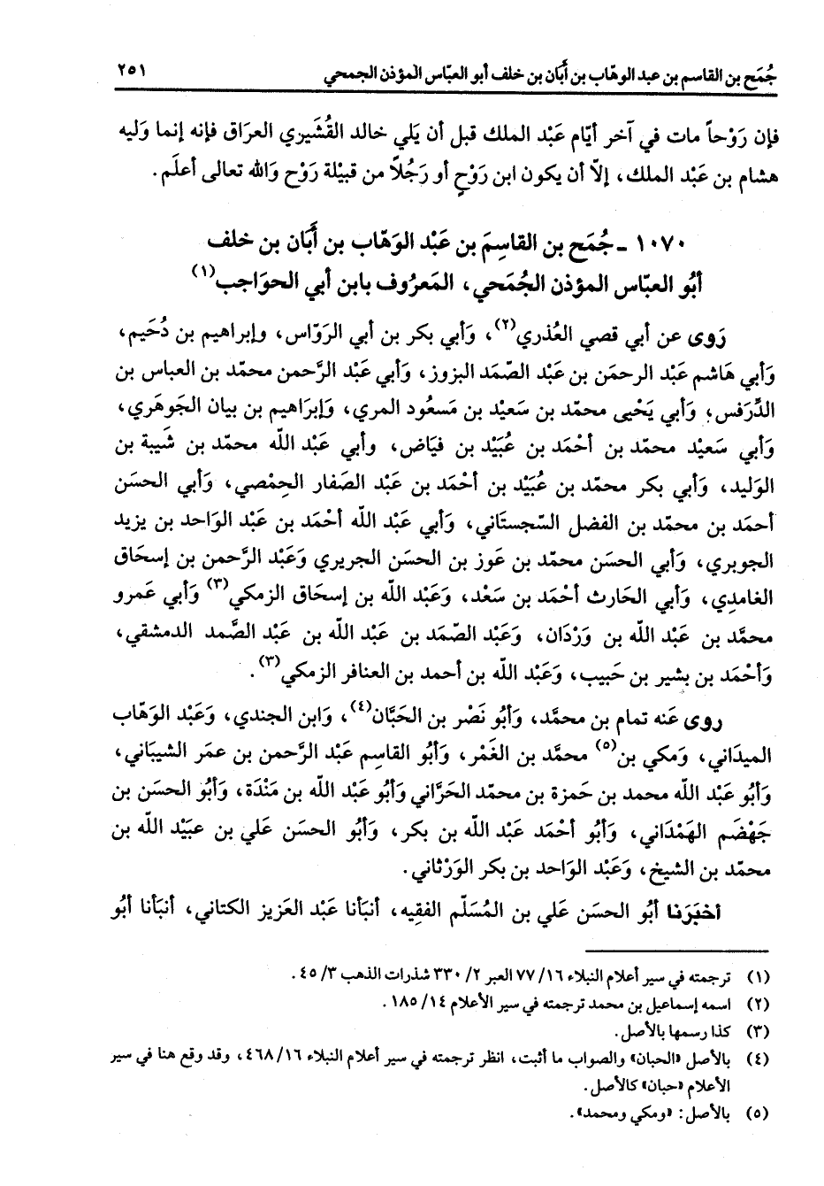 1070 - جمح بن القاسم بن عبد الوهاب بن أبان بن خلف أبو العباس المؤذن الجمحي المعروف بابن أبي الحواجب (1) روى عن أبي قصي العذري (2) وأبو بكر بن أبي الرواس وإبراهيم بن دحيم وأبي هاشم عبد الرحمن بن عبد الصمد البزوز وأبي عبد الرحمن محمد بن العباس الدرفس وأبي يحيى محمد بن سعيد بن مسعود المري وإبراهيم بن بيان الجوهري وأبي سعيد محمد بن أحمد بن عبيد بن فياض وأبي عبد الله محمد بن شيبة بن الوليد وأبي بكر محمد بن عبيد بن أحمد بن عبد الصفار الحمصي وأبي الحسن أحمد بن محمد بن الفضل السجستاني وأبي عبد الله أحمد بن عبد الواحد بن يزيد الجوبري وأبي الحسن محمد بن عوز بن الحسن الجريري وعبد الرحمن بن إسحاق الغامدي وأبي الحارث أحمد بن سعد وعبد الله بن إسحاق الزمكي (3) وأبي عمرو محمد بن عبد الله بن وردان وعبد الصمد بن عبد الله بن عبد الصمد الدمشقي وأحمد بن بشير بن حبيب وعبد الله بن أحمد بن العنافر الزمكي (3) روى عنه تمام بن محمد وأبو نصر بن الحبان (4) وابن الجندي وعبد الوهاب الميداني ومكي بن (5) محمد بن الغمر وأبو القاسم عبد الرحمن بن عمر الشيباني وأبو عبد الله محمد بن حمزة بن محمد الحراني وأبو عبد الله بن مندوأبو الحسن بن جهضم الهمداني وأبو أحمد عبد الله بن بكر وأبو الحسن علي بن عبيد الله بن محمد بن الشيخ وعبد الواحد بن بكر الورثاني أخبرنا أبو الحسن علي بن المسلم الفقيه أنبانا عبد العزيز الكتاني أنبأنا أبو