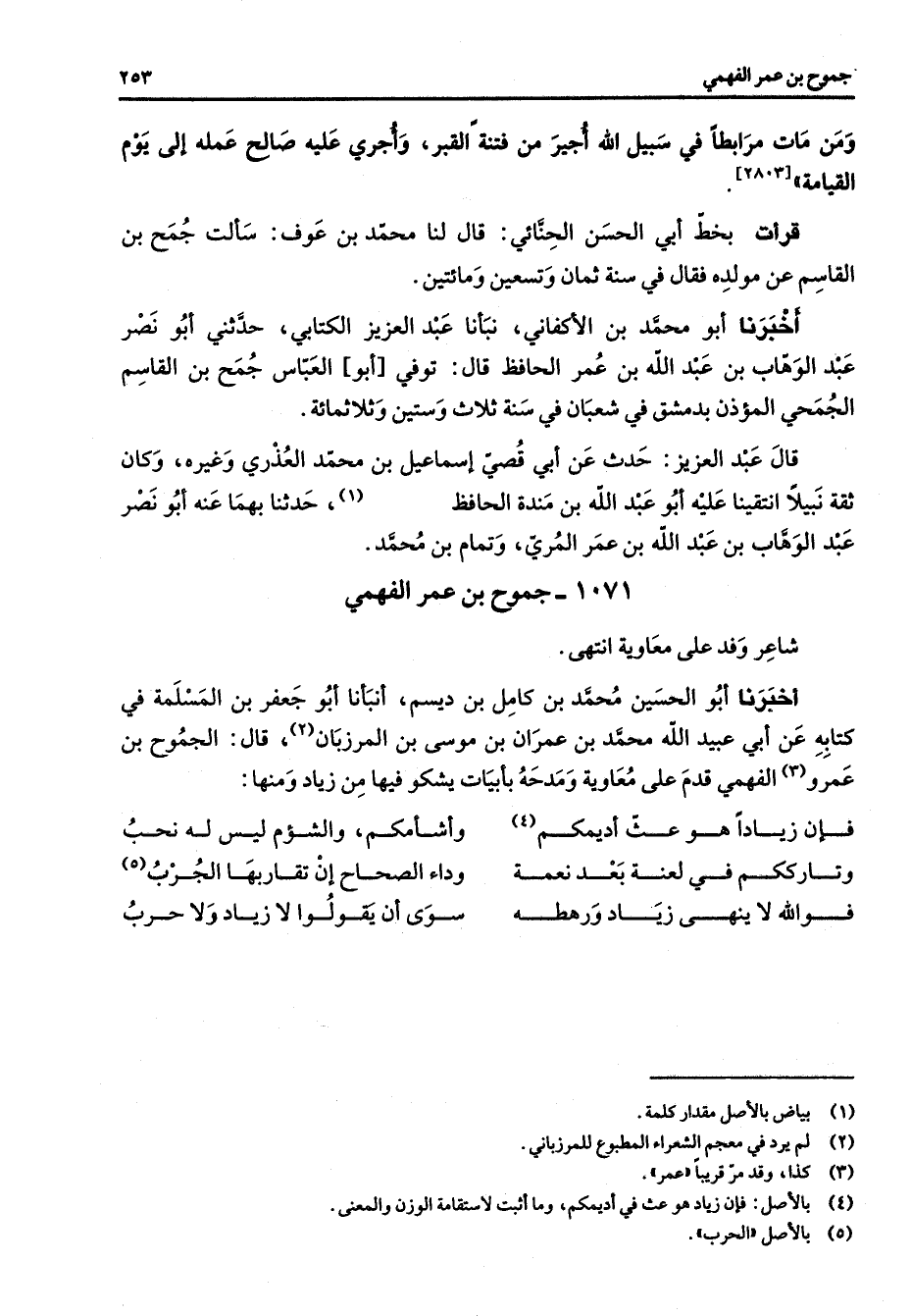 1071 - جموح بن عمر الفهمي شاعر وفد على معاوية انتهى أخبرنا أبو الحسين محمد بن كامل بن ديسم أنبانا أبو جعفر بن المسلمة في كتابه عن أبي عبيد الله محمد بن عمران بن موسى بن المرزبان (2) قال الجموح بن عمرو (3) الفهمي قدم على معاوية ومدحه بأبيات يشكو فيها من زياد ومنها فإن زيادا هو عث أديمكم (4) * وأشامكم والشؤم ليس له نحب وتارككم في لعنة بعد نعمة * وداء الصحاح إن تقاربها الجرب (5) فو الله لا ينهى زياد ورهطه * سوى أن يقولوا لا زياد ولا حرب * "