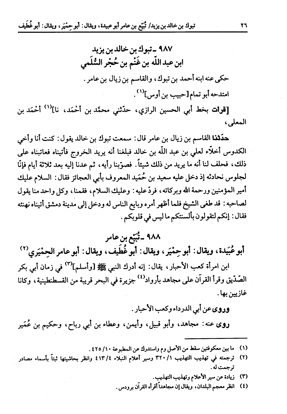 988 - تبيع بن عامر أبو عبيدة ويقال أبو حمير ويقال أبو غطيف ويقال أبو عامر الحميري ابن امرأة كعب الأحبار يقال إنه أدرك النبي (صلى الله عليه وسلم) وأسلم (3) في زمان أبي بكر الصديق وقرأ القرآن على مجاهد بأرواد (4) جزيرة في البحر قريبة من القسطنطينية وكانا غازيين بها وروى عن أبي الدرداء وكعب الأحبار روى عنه مجاهد وأبو قبيل وأيمن وعطاء بن أبي رباح وحكيم بن عمير