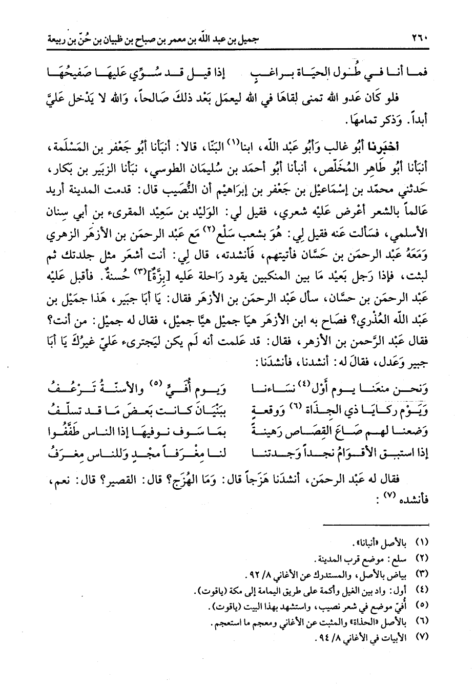 فما أنا في طول الحياة براغب * إذا قيل قد سوي عليها صفيحها * فلو كان عدو تمنى لقاها في الله ليعمل بعد ذلك صالحا والله لا يدخل علي أبدا وذكر تمامها أخبرنا أبو غالب وأبو عبد الله ابنا (1) البنا قالا أنبأنا أبو جعفر بن المسلمة أنبأنا أبو طاهر المخلص أنبأنا أبو أحمد بن سليمان الطوسي نبأنا الزبير بن بكار حدثني محمد بن إسماعيل بن جعفر بن إبراهيم أن النصيب قال قدمت المدينة أريد عالما بالشعر أعرض عليه شعري فقيل لي الوليد بن سعيد المقرئ بن أبي سنان الأسلمي فسألت عنه فقيل لي هو بشعب سلع (2) مع عبد الرحمن بن الأزهر الزهري ومعه عبد الرحمن بن حسان فأتيتهم فأنشدته قال لي أنت أشعر مثل جلدتك ثم لبثت فإذا رجل بعيد ما بين المنكبين يقود راحلة عليه بزة (3) حسنة فأقبل عليه عبد الرحمن بن حسان سأل عبد الرحمن بن الأزهر فقال يا أبا جبير هذا جميل بن عبد الله العذري فصاح به ابن الأزهر هيا جميل هيا جميل فقال له جميل من أنت فقال عبد الرحمن بن الأزهر فقال قد علمت أنه لم يكن ليجترئ على غيرك يا أبا جبير وعدل فقال له أنشدنا فأنشدنا ونحن منعنا يوم أول (4) نساءنا * ويوم أفي (5) والأسنة ترعف ويوم ركايا ذي الجذاة (6) ووقعة * ببنيان كانت بعض ما قد تسلف وضعنا لهم صاع القصاص رهينة * بما سوف نوفيها إذا الناس طفقوا إذا استبق الأقوام نجدا وجدتنا * لنا مغرفا مجد وللناس مغرف * فقال له عبد الرحمن أنشدنا هزجا قال وما الهزج قال القصير قال نعم فأنشده (7) *