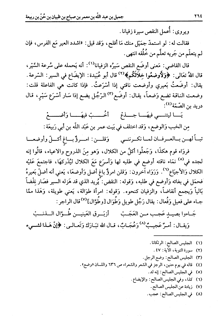 ويروي أعمل النقص سيرة زفيانا فقالت له لو استمد جميل منك ما أفلح وقد قيل اشدد العير مع الفرس فإن لم يتعلم من جريه تعلم من خلقه انتهى قال القاضي معنى أوضع النقص سيرة الزفيانا (1) أنه يحمله على سرعة السير قال الله تعالى " ولأوضعوا خلالكم (2) " قال أبو عبيدة الإيضاع في السير السرعة يقال أوضعت بعيري وأوضعت ناقتي إذا أسرعت فإذا كانت هي الفاعلة قلت وضعت الناقة تضع وضعا يقال أوضع (3) الرجل يضع إذا سار أسرع سيرقال دريد بن الصمة (4) يا ليتني فيها جذع * أخب فيها وأضع * من الخبب والوضع وقد اختلف في بيت عمر بن عبد الله بن أبي ربيعة تبا لهن بالعرفان لما نكرنني * وقلن امرؤ باغ أكل واضعا * فرواه قوم هكذا وجعلوا أكل من الكلال وهو من الذروح والأعياء قالوا إنه لجده في (5) نماء ناقته أوضع في طلبه لها وأسرع مع الكلال ليدركها فاجتمع عليه الكلال والأجياع (6) ورواه آخرون وقلن امرؤ باغ أضل وأوضعا يعني أنه أضل بعيره فحمل في بغائه وأوضع في طلبه وقوله النقض يريد الذي قد هزله السير فصار نقضا باليا ويجمع أنقاضا والزفيان كنحوه وقوله امرأة طوالة يعني طويلة وهذا مما جاء على فعيل وفعال يقال رجل طويل وطوال وطوال (7) قال الراجر * جاءوا بصيد عجب من العجب * أزبرق العينين طوال الذنب * ويقال أمر عجيب (8) وعجاب قال الله تبارك وتعالى " إن هذا لشئ " "