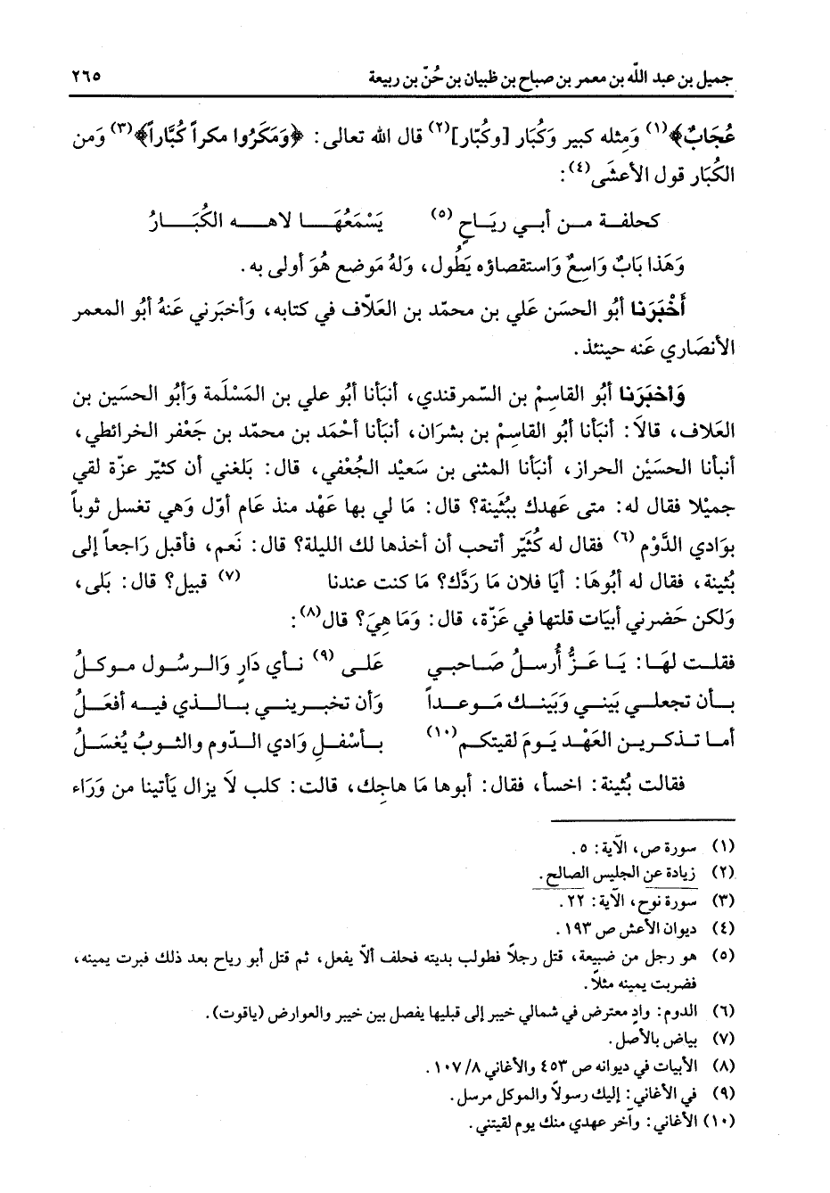 عجاب (1) " ومثله كبير وكبار (2) وكبار قال الله تعالى " ومكروا مكرا كبارا (3) " ومن الكبار قول الأعشى (4) كحلفة من أبي رياح (5) * يسمعها لاهه الكبار * وهذا باب واسع واستقصاؤه يطول وله موضع هو أولى به أخبرنا أبو الحسن علي بن محمد بن العلاف في كتابه وأخبرني عنه أبو المعمر الأنصاري عنه حينئذ وأخبرنا أبو القاسم بن السمرقندي أنبأنا أبو علي بن المسلمة وأبو الحسين بن العلاف قالا أنبأنا أبو القاسم بن بشران أنبأنا أحمد بن محمد بن جعفر الخرائطي أنبأنا الحسين الحراز أنبأنا المثنى بن سعيد الجعفي قال بلغني أن كثير عزة لقي جميلا فقال له متى عهدك ببثينة قال ما لي بها عهد منذ عام أول وهي تغسل ثوبا بوادي الدوم (6) فقال له كثير أتحب أن آخذها لك الليلة قال نعم فأقبل راجعا إلى بثينة فقال لها أبوها أيا فلان ما ردك ما كنت عندنا (7) قبيل قال بلى ولكن حضرني أبيات قلتها في عزة قال وما هي قال (8) فقلت لها يا عز أرسل صاحبي * على (9) نأي دار والرسول موكل بأن تجعلي بيني وبينك موعدا * وأن تخبريني بالذي فيه أفعل أما تذكرين العهد يوم لقيتكم (10) * بأسفل وادي الدوم والثوب يغسل * فقالت بثينة اخسأ فقال أبوها ما هاجك قالت كلب لا يزال يأتينا من وراء