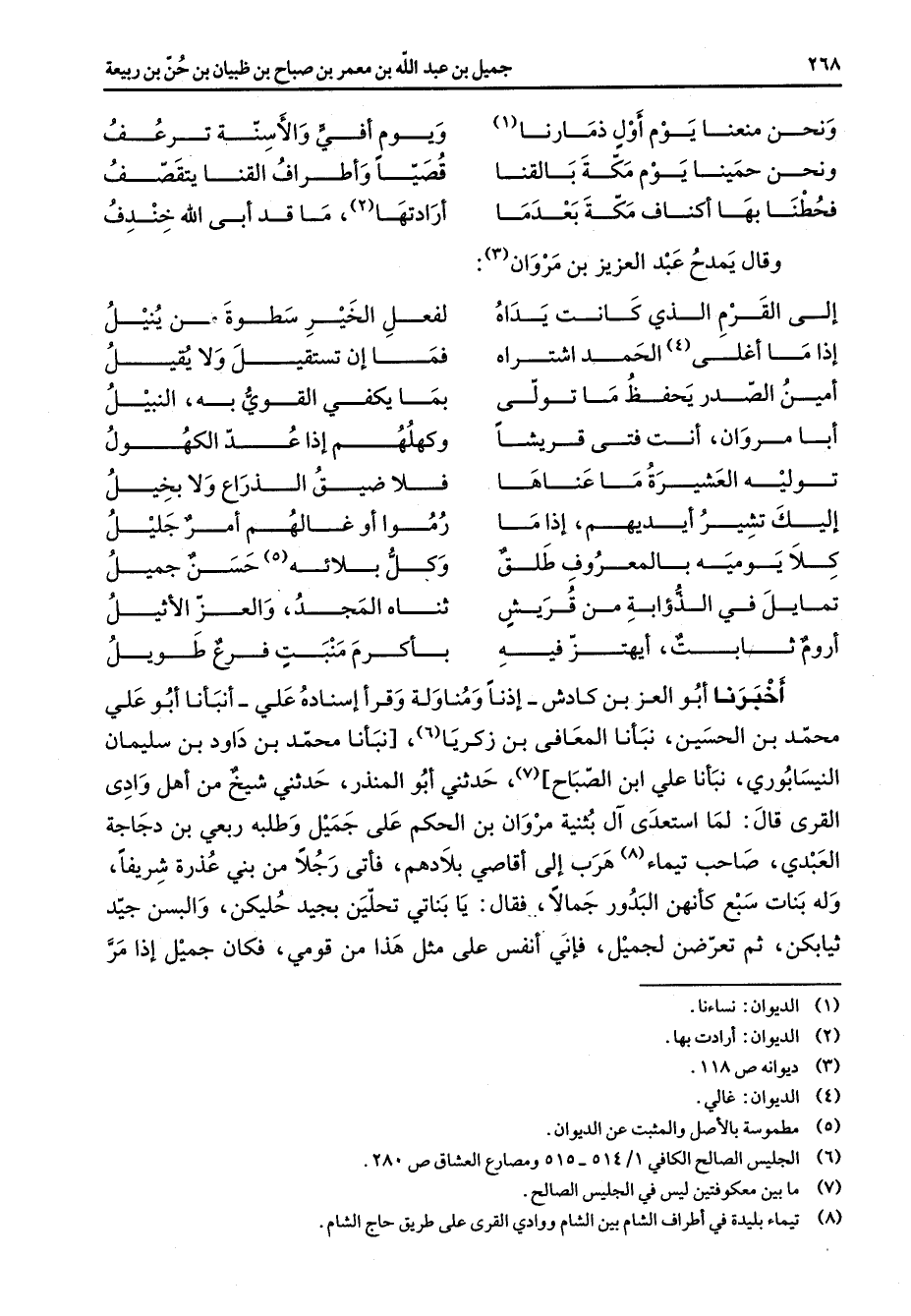 ونحن منعنا يوم أول ذمارنا (1) * ويوم أفئ والأسنة ترعف ونحن حمينا يوم مكة بالقنا * قصيا وأطراف القنا يتقصف فحطنا بها أكناف مكة بعدما * أرادتها (2) ما قد أبى اللخندف * وقال يمدح عبد العزيز بن مروان (3) إلى القرم الذي كانت يداه * لفعل الخير سطوة من ينيل إذا ما أغلى (4) الحمد اشتراه * فما إن تستقيل ولا يقيل أمين الصدر يحفظ ما تولى * بما يكفي القوي به النبيل أبا مروان أنت فتى قريشا * وكهلهم إذا عد الكهول توليه العشيرة ما عناها * فلا ضيق الذراع ولا بخيل إليك تشير أيديهم إذا ما * رموا أو غالهم أمر جليل كلا يوميه بالمعروف طلق * وكل بلائه (5) حسن جميل تمايل في الذؤابة من قريش * ثناه المجد والعز الأثيل أروم ثابت أيهتز فيه * بأكرم منبت فرع طويل * أخبرنا أبو العز بن كادش إذنا ومناولة وقرأ بإسناده علي أنبأنا أبو علي محمد بن الحسين نبأنا المعافى بن زكريا (6) نبأنا محمد بن داود بن سليمان النيسابوري نبأنا علي بن الصباح (7) حدثني أبو المنذر حدثني شيخ من أهل وادي القرى قال لما استعدى آل بثينة مروان بن الحكم على جميل وطلبه ربعي بن دجاجة العبدي صاحب تيماء (8) هرب إلى أقاصي بلادهم فأتى رجلا من بني عذرة شريفا وله بنات سبع كأنهن البدور جمالا فقال يا بناتي تحلين بجيد حليكن وألبسن جيد ثيابكن ثم تعرضن لجميل فإني أنفس على مثل هذا من قومي فكان جميل إذا مر