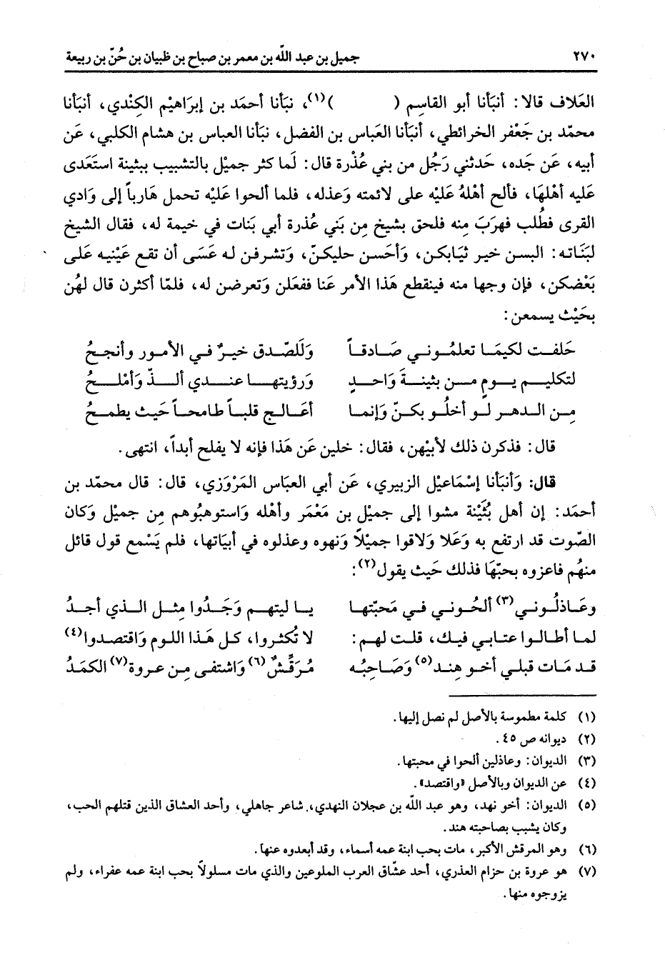 (7) هو عروة بن حزام العذري أحد عشاق العرب الملوعين والذي مات مسلولا بحب ابنة عمه عفراء ولم يزوجوه منها