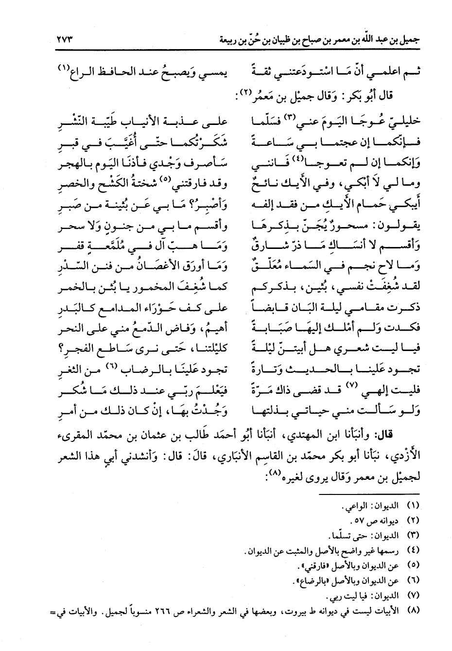 ثم اعلمي أن ما استودعتني ثقة * يمسي ويصبح عند الحافظ الراع (1) * قال أبو بكر وقال جميل بن معمر (2) خليلي عوجا اليوم عني (3) فسلما * على عذبه الأنياب طيبة النشر فإنكما إن عجتما بي ساعة * شكرتكما حتى أغيب في قبر وإنكما إن لم تعوجا (4) فأنني * سأصرف وجدي فأذنا اليوم بالهجر ومالي لاأبكي وفي الأيك نائح * وقد فارقتني (5) شختة الكشح والخصر أيبكي حمام الأيك من فقد إلفه * وأصبر مابي عن بثينة من صبر يقولون مسحور يجن بذكرها * وأقسم مابي من جنون ولا سحر وأقسم لا أنساك ما ذر شارق * وما هب آل في ملمعة قفر وما لاح نجم في السماء معلق * وما أورق الأغصان من فنن السدر لقد شغفت نفسي بثين بذكركم * كما شغف المخمور يابثن بالخمر ذكرت مقامي ليلة البان قابضا * على كف حوراء المدامع فكدت ولم أملك إليها صبابة * أهيم وفاض الدمع مني على النحر فيا ليت شعري هل أبيتن ليلة * كليلتنا حتى نرى ساطع الفجر تجود علينا بالحديث وتارة * تجود علينا بالرضاب (6) من الثغر فليت إلهي (7) قد قضى ذاك مرة * فيعلم ربي عند ذلك ما شكر ولو سألت مني حياتي بذلتها * وجدت بها إن كان ذلك من أمر * قال وأنبأنا ابن المهتدي أنبأنا أبو أحمد طالب بن عثمان بن محمد المقرئ الأزدي نبأنا أبو بكر محمد بن القاسم الأنباري قال قال وأنشدني أبي هذا الشعر لجميل بن معمر وقال يروي لغيره (8) *
