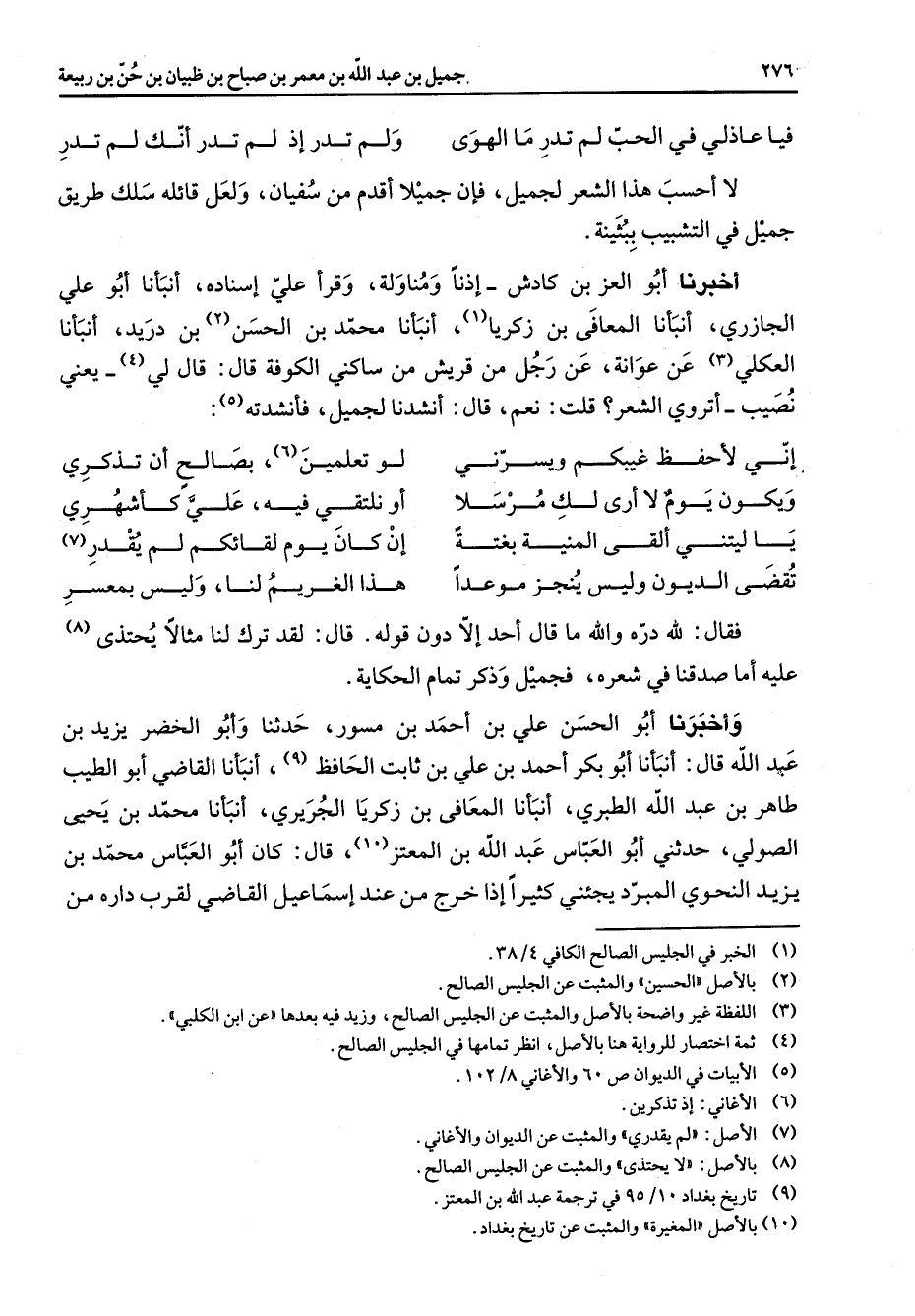 فيا عاذلي في الحب لم تدر ما الهوى * ولم تدر إذ لم تدر أنك لم تدر * لا أحسب هذا الشعر لجميل فإن جميلا اقدم من سفيان ولعل قائله سلك طريق جميل في التشبيب ببثينة أخبرنا أبو العز بن كادش إذنا ومناولة وقرأ علي إسناده أنبأنا أبو علي الجازري أنبأنا المعافى بن زكريا (1) أنبأنا محمد بن الحسن (2) بن دريد أنبأنا العكلي (3) عن عوانة عن رجل من قريش من ساكني الكوفة قال قال لي (4) يعني نصيب أتروي الشعر قلت نعم قال أنشدنا لجميل فأنشدته (5) إني لأحفظ غيبكم ويسرني * لو تعلمين (6) بصالح أن تذكري ويكون يوم لا أرى لك مرسلا * أو نلتقي فيه علي كأشهري ياليتني ألقى المنية بغتة * إن كان يوم لقائكم لم يقدر (7) تقضى الديون وليس ينجز موعدا * هذا الغريم لنا وليس بمعسر * فقال لله دره والله ما قال أحد إلا دون قوله قال لقد ترك لنا مثالا يحتذى (8) عليه أما صدقنا في شعره فجميل وذكر تمام الحكاية أخبرنا أبو الحسن علي بن أحمد بن مسور حدثنا وأبو الخضر يزيد بن عبد الله قال أنبأنا أبو بكر أحمد بن علي بن ثابت الحافظ (9) أنبأنا القاضي أبو الطيب طاهر بن عبد الله الطبري أنبأنا ألمعافى بن زكريا الجريري أنبأنا محمد بن يحيى الصولي حدثني أبو العباس عبد الله بن المعتز (10) قال كان أبو العباس محمد بن يزيد النحوي المبرد يجئني كثيرا إذا خرج من عند إسماعيل القاضي لقرب داره من