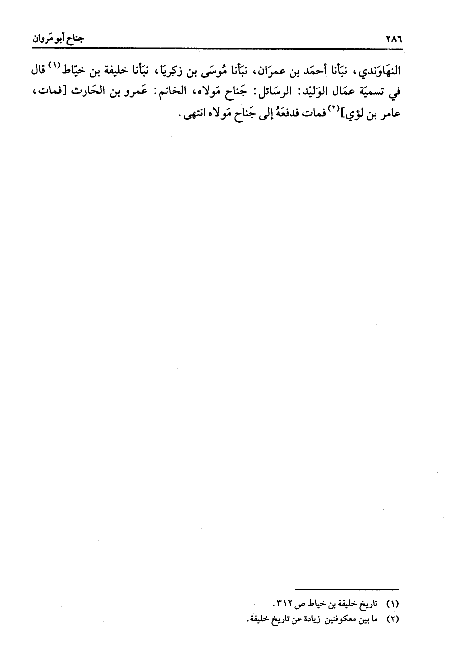 النهاوندي نبأنا أحمد بن عمران نبأنا موسى بن زكريا بن خليفة بن خياط (1) قال في تسمية عمال الوليد الرسائل جناح مولاه الخاتم عمرو بن الحارث فمات عامر بن لؤي (2) فمات فدفعه إلى جناح مولاه انتهى