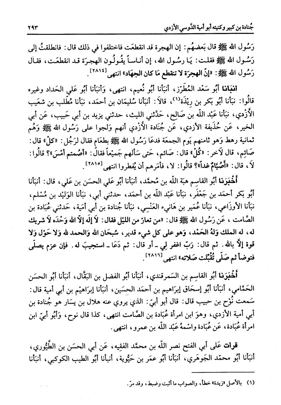 [2816] أخبرنا أبو القاسم بن السمرقندي أنبانا أبو الفضل بن البقال أنبأنا أبو الحسن الحمامي أنبأنا أبو إسحاق إبراهيم بن أحمد الحسين أنبأنا إبراهيم بن أبي أمية قال سمعت نوح بن حبيب قال قال أبو أبي الذي يروي عنه هلال بن يسار هو جنادة بن أبي أمية الأزدي وهو ابن امرأة عبادة بن الصامت انتهى كذا قال نوح وأبو أبي ابن امرأة عبادة عن عبادة واسمه عبد الله بن عمرو انتهى قرأت على أبي الفتح نصر الله بن محمد الفقيه عن أبي الحسن بن الطيوري أنبأنا أبو محمد الجوهري أنبانا أبو عمر بن حيوية أنبأنا أبو الطيب الكوكبي أنبأنا