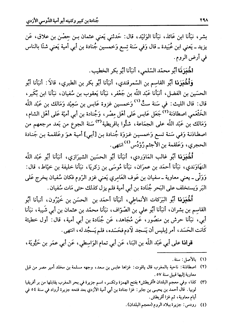 بشر نبأنا ابن عائد نبأنا الوليد قال حدثني يعني عثمان بن حصن بن علاق عن يزيد يعني ابن عبيدة قال وفي سنة تسع وخمسين جنادة بن أبي أمية يعني شتا بالناس في أرض الروم أخبرنا أبو محمد السلمي أنبأنا أبو بكر الخطيب وأخبرنا أبو القاسم بن السمرقندي أنبأنا أبو بكر بن الطبري قالا أنبأنا أبو الحسين بن الفضل أنبأنا عبد الله بن جعفر نبأنا يعقوب بن سفيان نبأنا ابن بكير قال قال الليث في سنة ست (1) وخمسين غزوة عابس بن سعيد ومالك بن عبد الله الخثعمي اصطاذنة (2) جعل عابس على أهل مصر وجنادة بن أبي أمية على أهل الشام ومالك بن عبد الله على الجماعة شتوا بإقريطية (3) سنة الجوع من بعد مرجعهم من اصطاذنة وفي سنة تسع وخمسين غزوة جنادة بن أبي أمية هو وعلقمة بن جنادة الحجري وعلقمة بن الأجثم رودس (4) انتهى أخبرنا أبو غالب الماوردي أنبأنا أبو الحسين الشيرازي أنبأنا أبو عبد الله النهاوندي نبأنا أحمد بن عمران نبأنا موسى بن زكريا نبأنا خليفة بن خياط قال وولى يعني معاوية سفيان بن عوف العامري يعني غزالروم فكان سفيان يخرج على البر ويستخلف على البحر جنادة بن أبي أمية فلم يزل كذلك حتى مات سفيان أخبرنا أبو البركات الأنماطي أنبأنا أحمد بن الحسن بن خيرون أنبأنا أبو القاسم بن بشران أنبأنا أبو علي بن الصواف نبأنا محمد بن عثمان بن أبي شيبة نبأنا أبي نبأنا حرش بن منصور عن مجاهد عن جنادة بن أبي أمية قال أول خطيئة كانت الحسد أمر إبليس أن يسجد لآدم فحسده فلم يسجد له انتهى قرأنا على أبي عبد الله بن البنا عن أبي تمام الواسطي عن أبي عمر بن حيوية
