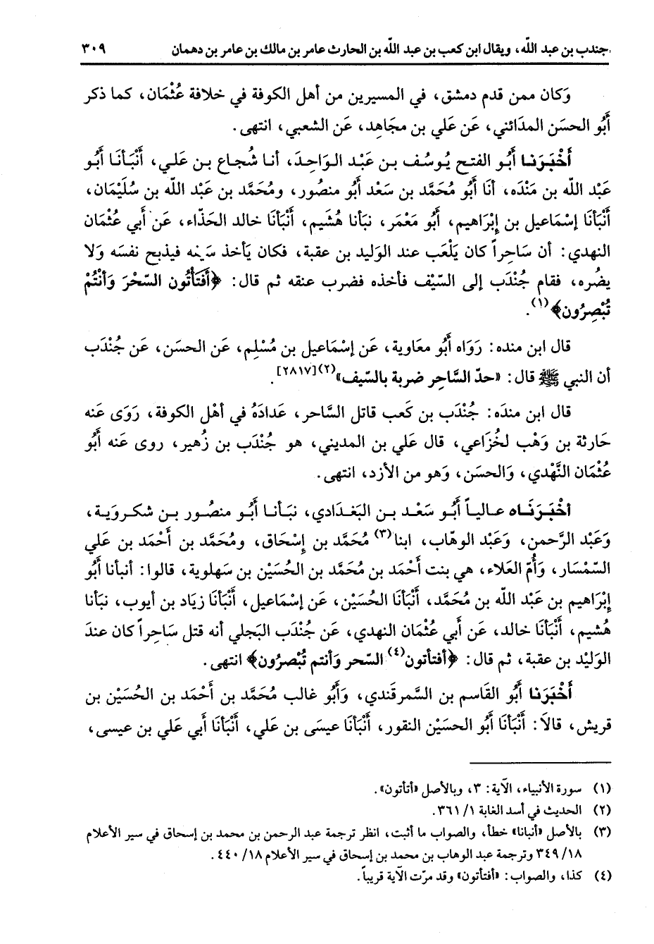 [2817] ح قال ابن مندة جندب بن كعب قاتل الساحر عداده في أهل الكوفة روى عنه حارثة بن وهب الخزاعي قال علي بن المديني هو جندب بن زهير روى عنه أبو عثمان النهدي والحسن وهو من الأزد انتهى أخبرناه عاليا أبو سعد بن البغدادي نبأنا أبو منصور شكرويه وعبد الرحمن وعبد الوهاب ابنا (3) محمد بن إسحاق ومحمد بن أحمد بن علي السمسار وأم العلاء هي بنت أحمد بن محمد بن الحسين بن سهلوية قالوا أنبأنا أبو إبراهيم بن عبد الله بن محمد أنبأنا الحسين عن إسماعيل أنبأنا زياد بن أيوب نبأنا هشيم أنبأنا خالد عن أبي عثمان النهدي عن جندب البجلي أنه قتل ساحرا كان عند الوليد بن عقبة ثم قال " أفتأتون (4) السحر وأنتم تبصرون " انتهى أخبرنا أبو القاسم بن السمرقندي وأبو غالب محمد بن أحمد بن الحسين بن قريش قالا أنبأنا أبو الحسين النقور أنبأنا عيسى بن علي أنبأنا أبي علي بن عيسى