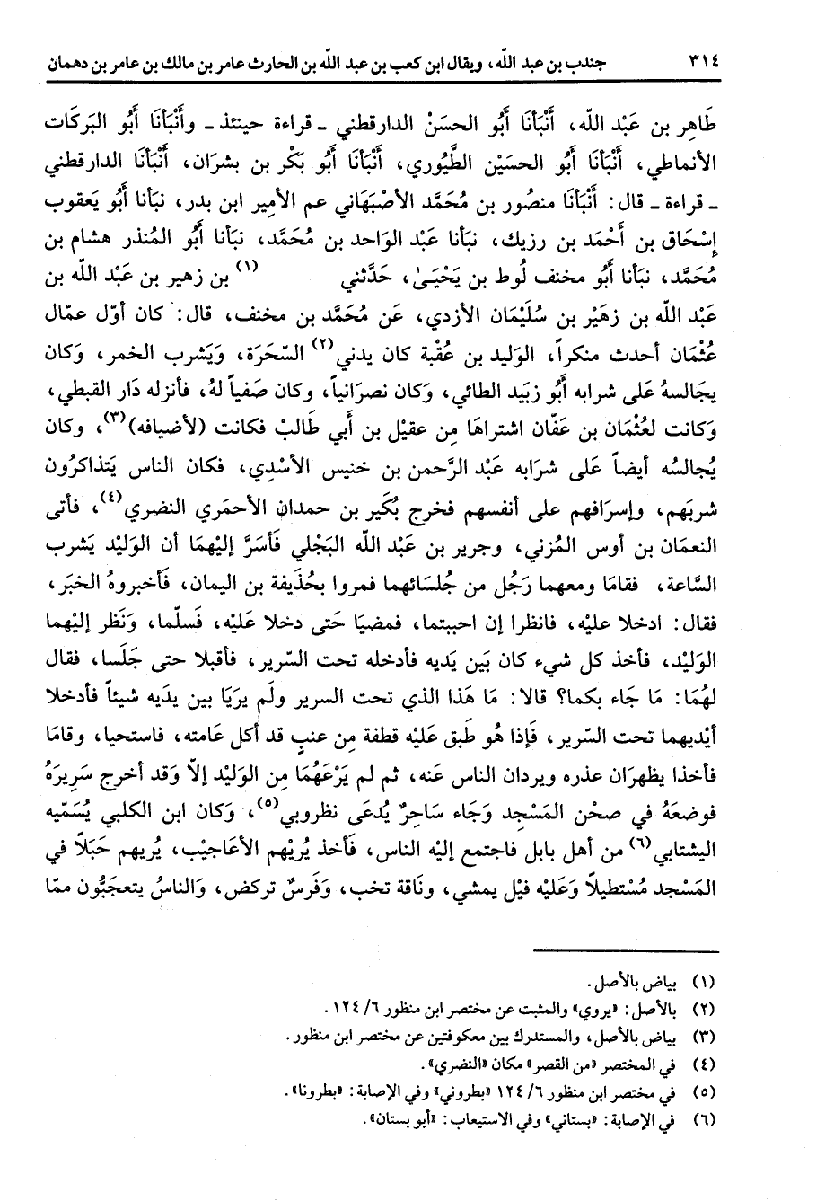 طاهر بن عبد الله أنبأنا أبو الحسن الدارقطني قراءة حينئذ وأنبأنا أبو البركات الأنماطي أنبأنا أبو الحسين الطيوري أنبأنا أبو بكر بن بشران أنبأنا الدارقطني قراءة قال أنبأنا منصور بن محمد الأصبهاني عم الأمير ابن بدر نبأنا أبو يعقوب إسحاق بن أحمد بن رزيك نبأنا عبد الواحد بن محمد نبأنا أبو المنذر هشام بن محمد نبأنا أبو مخنف لوط بن يحيى حدثني (1) بن زهير بن عبد الله بن عبد الله بن زهير بن سليمان الأزدي عن محمد بن مخنف قال كان أول عمال عثمان أحدث منكرا الوليد بن عقبة كان يدني (2) السحرة ويشرب الخمر وكان يجالسه على شرابه أبو زبيد الطائي وكان نصرانيا وكان صفيا له فأنزله دار القبطي وكانت لعثمان بن عفان اشتراها من عقيل بن أبي طالب فكانت لأضيافه (3) وكان يجالسه أيضا على شرابه عبد الرحمن بن خنيس الأسدي فكان الناس يتذاكرون شربهم وإسرافهم على أنفسهم فخرج بكير بن حمدان الأحمري النضر (4) فأتى النعمان بن أوس المزني وجرير بن عبد الله البجلي فأسر إليهما أن الوليد يشرب الساعة فقاما ومعهما رجل من جلسائهما فمروا بحذيفة بن اليمان فأخبروه الخبر فقال ادخلا عليه فانظرا إن أحببتما فمضيا حتى دخلا عليه فسلما ونظر إليهما الوليد فأخذ كل شئ كان بين يديه فأدخله تحت السرير فأقبلا حتى جلسا فقال لهما ما جاء بكما قالا ما هذا الذي تحت السرير ولم يريا بين يديه شيئا فأدخلا أيديهما تحت السرير فإذا هو طبق عليه قطفة من عنب قد أكل عامته فاستحيا وقاما فأخذا يظهران عذره ويردان الناس عنه ثم لم يرعهما من الوليد إلا وقد أخرج سريره فوضعه في صحن المسجد وجاء ساحر يدعى نظروبي وكان ابن الكلبي يسميه اليشتابي (6) من أهل بابل فاجتمع إليه الناس فأخذ يريهم الأعاجيب يريهم حبلا في المسجد مستطيلا وعليه فيل يمشي وناقة تخب وفرس تركض والناس يتعجبون مما
