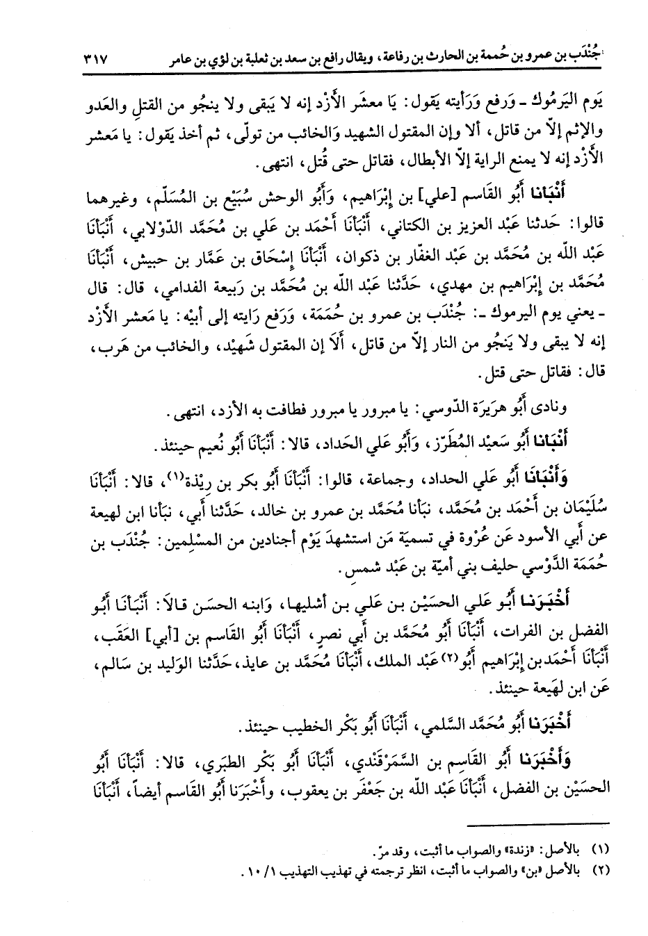 يوم اليرموك ورفع ورأيته يقول يا معشر الأزد إنه لا يبقى ولا ينجو من القتل والعدو والإثم إلا من قاتل ألا وإن المقتول الشهيد والخائب من تولى ثم أخذ يقول يا معشر الأزد إنه لا يمنع الراية إلا الأبطال فقاتل حتى قتل انتهى أنبانا أبو القاسم علي بن إبراهيم وأبو الوحش سبيع بن المسلم وغيرهما قالوا حدثنا عبد العزيز بن الكتاني أنبأنا أحمد بن علي بن محمد الدولابي أنبأنا عبد الله بن محمد بن عبد الغفار بن ذكوان أنبأنا إسحاق بن عمار بن حبيش أنبأنا محمد بن إبراهيم بن مهدي حدثنا عبد اله بن محمد بن ربيعة الفدامي قال قال يعني يوم اليرموك جندب بن عمرو بن حممة ورفع رأيته إلى أبيه يا معشر الأزد إنه لا يبقى ولا ينجو من النار إلا من قاتل ألا إن المقتول شهيد وألخائب من هرب قال فقاتل حتى قتل ونادى أبو هريرة الدوسي يا مبرور يا مبرور فطافت به الأزد انتهى أنبأنا أبو سعيد المطرز وأبو علي الحداد قالا أنبأنا أبو نعيم حينئذ وأنبأنا أبو علي الحداد وجماعة قالوا أنبأنا أبو بكر بن ريذة (1) قالا أنبأنا سليمان بن أحمد بن محمد نبأنا محمد بن عمرو بن خالد حدثنا أبي نبأنا ابن لهيعة عن أبي الأسود عن عروة في تسمية من استشهد يوم أجنادين من المسلمين جندب بن حممة الدوسي حليف بني أمية بن عبد شمس أخبرنا أبو علي الحسين بن علي بن أشليها وابنه الحسن قالا أنبأنا أبو الفضل بن الفرات أنبأنا أبو محمد بن أبي نصر أنبأنا أبو القاسم بن أبي العقب أنبأنا أحمد بن إبراهيم أبو (2) عبد الملك أنبأنا محمد بن عايذ حدثنا الوليد بن سالم عن ابن لهيعة حينئذ أخبرنا أبو محمد السلمي أنبأنا أبو بكر الخطيب حينئذ وأخبرنا أبو القاسم بن السمرقندي أنبأنا أبو بكر الطبري قالا أنبأنا أبو الحسين بن الفضل أنبأنا عبد الله بن جعفر بن يعقوب وأخبرنا أبو القاسم أيضا أنبأنا