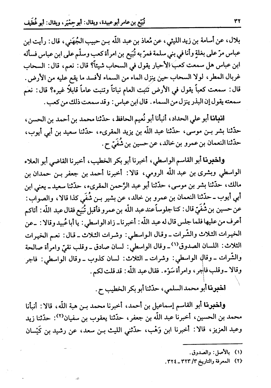 بلال عن أسامة بن زيد الليثي عن معاذ بن عبد الله بن حبيب الجهني قال رأيت ابن عباس مر على بغله وأنا في بني سلمة فمر به تبيع بن امرأة كعب وسلم على ابن عباس فسأله ابن عباس هل سمعت كعب الأحبار يقول في السحاب شيئا قال نعم قال السحاب غربال المطر لولا السحاب حين ينزل الماء من السماء لأفسد ما يقع عليه من الأرض قال سمعت كعبا يقول في الأرض تنبت العام نباتا وتنبت عاما قابلا غيره قال نعم سمعته يقول أن البذر ينزل من السماء قال ابن عباس وقد سمعت ذلك من كعب أنبأنا أبو علي الحداد أنبأنا أبو نعيم الحافظ حدثنا محمد بن أحمد بن الحسن حدثنا بشر بن موسى حدثنا عبد الله بن يزيد المقرئ حدثنا سعيد بن أبي أيوب حدثنا النعمان بن عمرو بن خالد عن حسين بن شفي ح وأخبرنا أبو القاسم الواسطي أخبرنا أبو بكر الخطيب أخبرنا القاضي أبو العلاء الواسطي وبشرى بن عبد الله الرومي قالا أخبرنا أحمد بن جعفر بن حمدان بن مالك حدثنا بشر بن موسى حدثنا أبو عبد الرحمن المقرئ حدثنا سعيد يعني ابن أبي أيوب حدثنا النعمان بن عمرو بن خالد عن بشير بن شفي كذا قالا والصواب عن حسين بن شفي قال كنا جلوسا عند عبد الله بن عمرو فأقبل تبيع فقال عبد الله أتاكم أعرف من عليها فلما جلس قال له عبد الله أخبرنا زاد الواسطي يا أبا عبيد الله وقالا عن الخيرات الثلاث والشرات وقال الواسطي وشرات الثلاث قال نعم الخيرات الثلاث اللسان الصدوق (1) وقال الواسطي لسان صادق وقلب نقي وامرأة صالحة والشرات وقال الواسطي وشرات الثلاث لسان كذوب وقال الواسطي فاجر وقالا وقلب فاجر وامرأة سوء فقال عبد الله قد قلت لكم أخبرنا أبو محمد السلمي حدثنا أبو بكر الخطيب ح وأخبرنا أبو القاسم إسماعيل بن أحمد أخبرنا محمد بن هبة الله قالا أنبأنا محمد بن الحسين أخبرنا عبد الله بن جعفر حدثنا يعقوب بن سفيان حدثنا زيد وعبد العزيز قالا أخبرنا ابن وهب حدثني الليث بن سعد عن رشيد بن كيسان