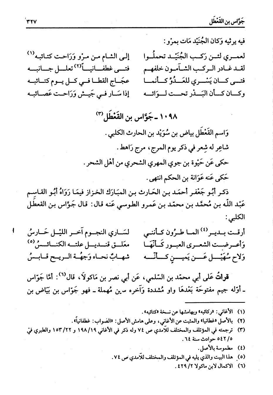 واسم القعطل بياض بن سويد بن الحارث الكلبي شاعر له شعر في ذكر يوم المرج مرج راهط حكى عن حيوة بن جوي المهري الشحري من أهل الشحر حكى عنه عوانة بن الحكم انتهى ذكر أبو جعفر أحمد بن الحارث بن المبارك الخزاز فيما رواه أبو القاسم عبد الله بن محمد بن محمد بن عمرو الطوسي عنه قال قال جواس بن القعطل الكلبي أرقت بدير (4) الماطرون كأنني * لساري النجوم آخر الليل حارس وأعرضت الشعرى العبور كأنها * معلق قنديل علته الكنائس (5) ولاح سهيل عن يمين كأنه * شهاب نحاه وجهه الريح قابس * قرأت على أبي محمد بن السلمي عن أبي نصر بن ماكولا قال (7) أما جواس أوله جيم مفتوحة بعدها واو مشددة وآخره سين مهملة فهو جواس بن بياض بن