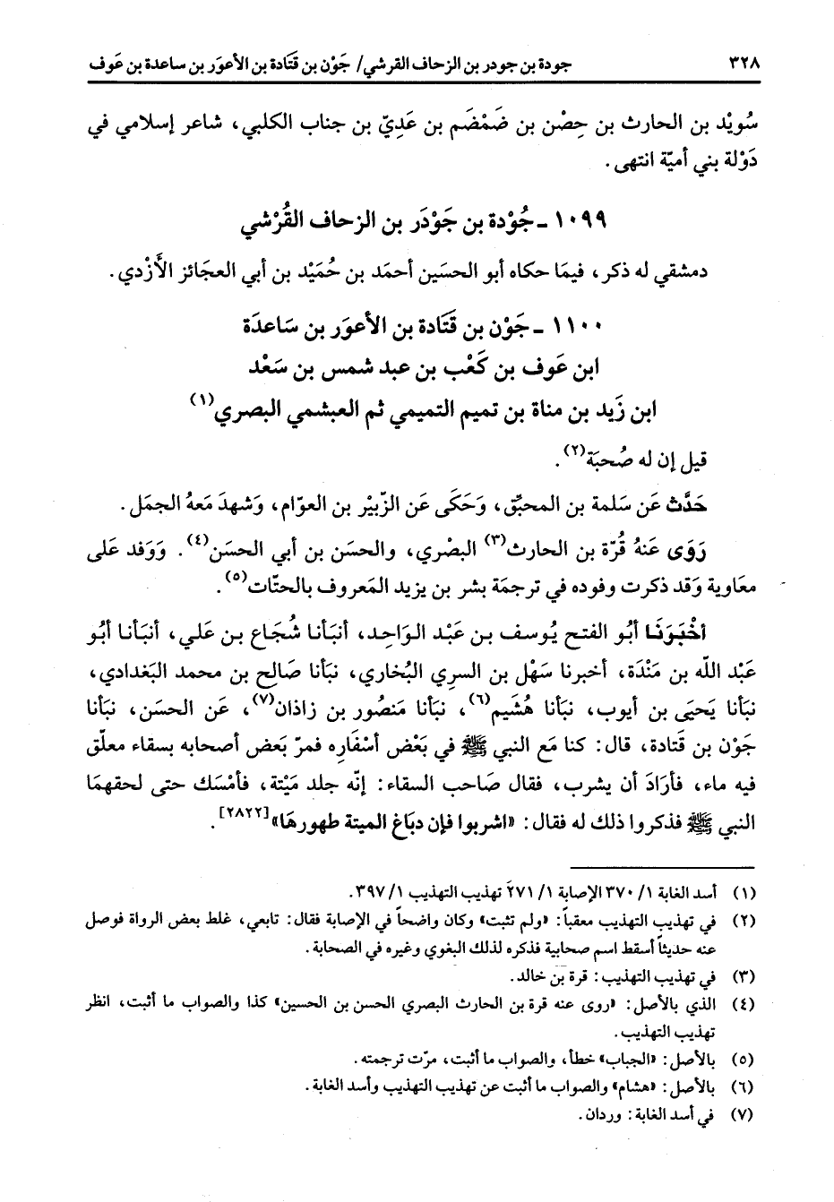1100 - جون بن قتادة بن الأعور بن ساعدة ابن عوف بن كعب بن عبد شمس بن سعد ابن زيد بن مناة بن تميم التميمي ثم العبشمي البصري (1) قيل إن له صحبة (2) حدث عن سلمة بن المحبق وحكى عن الزبير بن العوام وشهد معه الجمل روى عنه قرة بن الحارث (3) البصري والحسن بن أبي الحسن (4) ووفد على معاوية وقد ذكرت وفوده في ترجمة بشر بن يزيد المعروف بالحتات (5) أخبرنا أبو الفتح يوسف بن عبد الواحد أنبأنا شجاع بن علي أنبأنا أبو عبد الله بن مندة أخبرنا سهل بن السري البخاري نبأنا صالح بن محمد البغدادي نبأنا يحيى بن أيوب نبأنا هشيم (6) نبأنا منصور بن زاذان (7) عن الحسن نبأنا جون بن قتادة قال كنا مع النبي (صلى الله عليه وسلم) في بعض أسفاره فمر بعض أصحابه بسقاء معلق فيه ماء فأراد أن يشرب فقال صاحب السقاء إنه جلد ميتة فأمسك حتى لحقهما النبي (صلى الله عليه وسلم) فذكروا ذلك له فقال اشربوا فإن دباغ الميتة طهورها