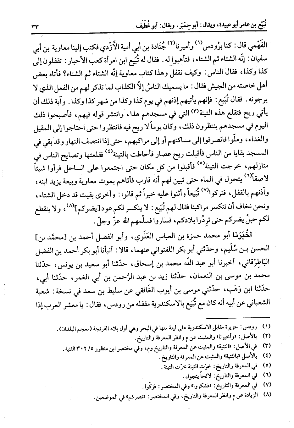 الفهمي قال كنا برودس (1) وأميرنا (2) جنادة بن أبي أمية الأزدي فكتب إلينا معاوية بن أبي سفيان إنه الشتاء ثم الشتاء فتأهبوا له فقال له تبيع ابن امرأة كعب الأحبار تقفلون إلى كذا وكذا فقال الناس وكيف نقفل وهذا كتاب معاوية إنه الشتاء ثم الشتاء فأتاه بعض أهل خاصته من الجيش فقال ما يسميك الناس إلا الكذاب لما تذكر لهم من الفعل الذي لا يرجونه فقال تبيع فإنهم يأتيهم إذنهم في يوم كذا وكذا من شهر كذا وكذا وآية ذلك أن يأتي ريح فتقلع هذه التينه (3) التي في مسجدهم هذا وانتشر قوله فيهم فأصبحوا ذلك اليوم في مسجدهم ينتظرون ذلك وكان يوما لا ريح فيه فانتظروا حتى احتاجوا إلى المقيل والغداء وملوا فانصرفوا إلى مساكنهم أو إلى مراكبهم حتى إذا انتصف النهار وقد بقي في المسجد بقايا من الناس فأقبلت ريح عصار فأحاطت بالتينة (4) فقلعتها وتصايح الناس في منازلهم خرجت التينة (5) فأقبلوا من كل مكان حتى اجتمعوا على الساحل فرأوا شيئا لاصقا (6) يتحول في الماء حتى تبين لهم أنه قارب فأتاهم بموت معاوية وبيعة يزيد ابنه وآذنهم بالقفل فتركوا (7) تبيعا وأثنوا عليه خيرا ثم قالوا وأخرى بقيت قد دخل الشتاء ونحن نخاف أن تتكسر مراكبنا فقال لهم تبيع لا ينكسر لكم عود يضركم (8) ولا ينقطع لكم حبل يضركم حتى تردوا بلادكم فساروا فسلمهم الله عز وجل أخبرنا أبو محمد حمزة بن العباس العلوي وأبو الفضل أحمد بن محمد بن الحسن بن سليم وحدثني أبو بكر اللفتواني عنهما قالا أنبأنا أبو بكر أحمد بن الفضل الباطرقاني أخبرنا أبو عبد الله محمد بن إسحاق حدثنا أبو سعيد بن يونس حدثنا محمد بن موسى بن النعمان حدثنا زيد بن عبد الرحمن بن أبي الغمر حدثنا أبي حدثنا ابن وهب حدثني موسى بن أيوب الغافقي عن سليط بن سعد في نسخة شعبة الشعباني عن أبيه أنه كان مع تبيع بالإسكندرية مقفلة من رودس فقال يا معشر العرب إذا