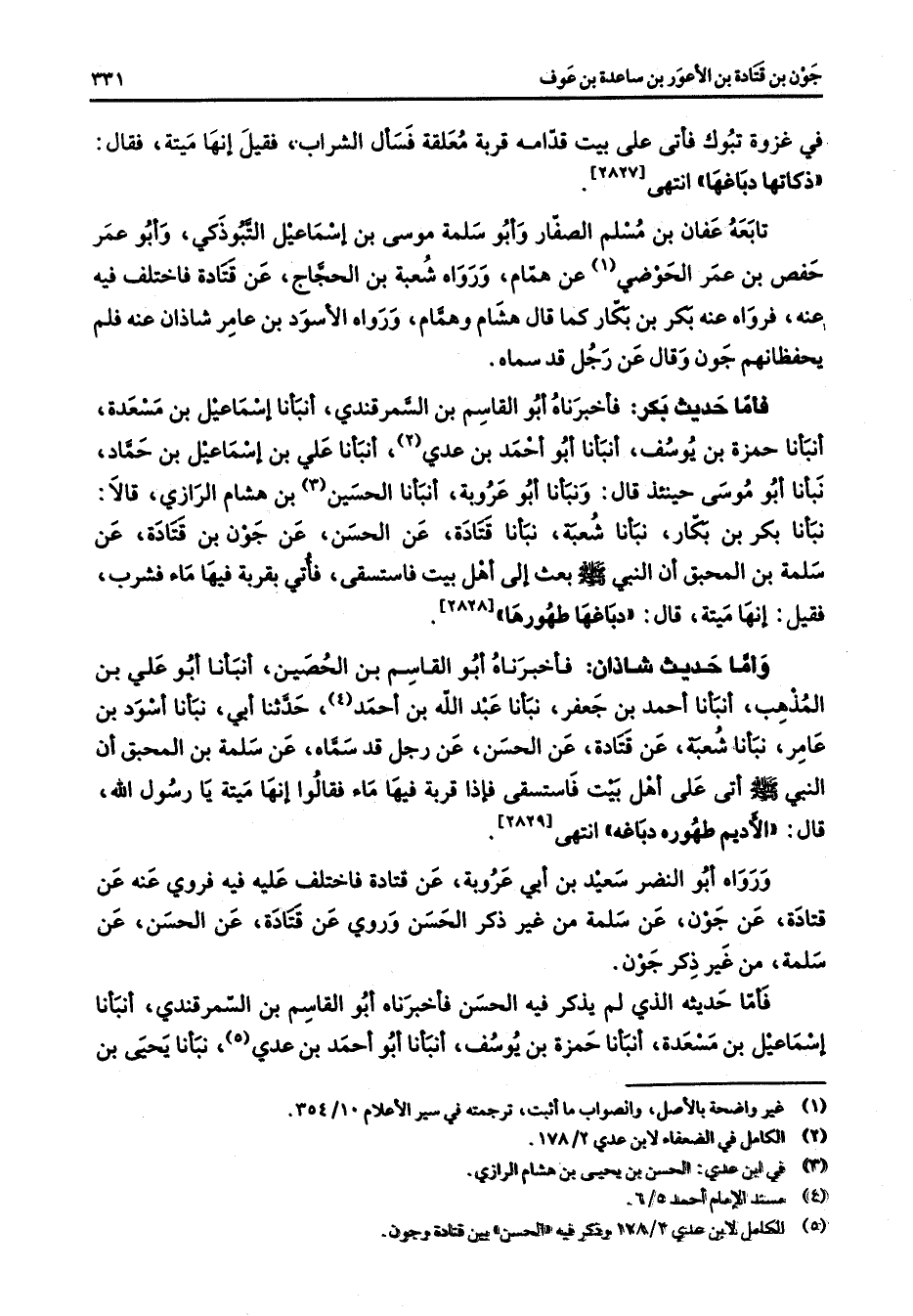 [2827] تابعه عفان بن مسلم الصفار وأبو سلمة موسى بن إسماعيل التبوذكي وأبو عمر حفص بن عمر الحوضي (1) عن همام ورواه شعبة بن الحجاج عن قتادة فاختلف فيه عنه فرواه عنه بكر بن بكار كما قال هشام وهمام ورواه الأسود بن عامر شاذان عنه فلم يحفظانهم جون وقال عن رجل قد سماه فأما حديث بكر فأخبرناه أبو القاسم بن السمرقندي أنبأنا إسماعيل بن مسعدة أنبأنا حمزة بن يوسف أنبأنا أبو أحمد بن عدي (2) أنبأنا علي بن إسماعيل بن حماد نبأنا أبو موسى حينئذ قال ونبأنا أبو عروبة أنبأنا الحسين (3) بن هشام الرازي قالا نبأنا بكر بن بكار نبأنا شعبة نبأنا قتادة عن الحسن عن جون بن قتادة عن سلمة بن المحبق أن النبي (صلى الله عليه وسلم) بعث إلى أهل بيت فاستسقى فأتي بقربة فيها ماء فشرب فقيل أنها ميتة قال دباغها طهورها