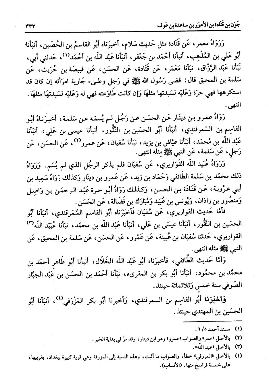 ورواه معمر عن قتادة مثل حديث سلام أخبرناه أبو القاسم بن الحصين أنبأنا أبو علي بن المذهب أنبأنا أحمد بن جعفر أنبأنا عبد الله بن احمد (1) حدثني أبي نبأنا عبد الرزاق نبأنا معمر عن قتادة عن الحسن عن قبيصة بن حريث عن سلمة بن المحبق قال قضى رسول الله (صلى الله عليه وسلم) في رجل وطئ جارية امرأته إن كان قد استكرهها فهي حرة وعليه لسيدتها مثلها وإن كانت طاوعته فهي له وعليه لسيدتها مثلها انتهى رواه عمرو بن دينار عن الحسن عن رجل لم يسمه عن سلمة أخبرناه أبو القاسم بن السمرقندي أنبأنا أبو الحسين بن النقور أنبأنا عيسى بن علي أنبأنا عبد الله بن محمد أنبأنا عياش بن يزيد نبأنا سفيان عن عمرو (2) عن الحسن عن رجل عن سلمة عن النبي (صلى الله عليه وسلم) مثله انتهى ورواه عبيد الله القواريري عن سفيان فلم يذكر الرجل الذي لم يسم ورواه ذلك محمد بن سلمة الطائغي وحماد بن زيد عن عمرو بن دينار وكذلك روه سعيد بن أبي عروبة عن قتادة بن الحسن وكذلك رواه أبو حرة عبد الرحمن بن واصل ومنصور بن زاذان ويونس بن عبيد ومبارك بن فضالة عن الحسن فأما حديث القواريري عن سفيان فأخبرناه أبو القاسم السمرقندي أنبأنا أبو الحسين بن النقور أنبأنا عيسى بن علي أنبأنا عبد اله بن محمد نبأنا عبيد الله (3) القواريري حدثنا سفيان بن عيينة عن عمرو عن الحسن عن سلمة بن المحبق عن النبي (صلى الله عليه وسلم) مثله انتهى وأما حديث الطائفي فأخبرناه أبو عبد الله الخلال أنبأنا أبو طاهر أحمد بن محمد بن محمود أنبأنا أبو بكر بن المقرئ نبأنا أحمد بن الحسن بن عبد الجبار الصوفي سنة خمس وثلاثمائة حينئذ وأخبرنا أبو القاسم بن السمرقندي وأخبرنا أبو بكر المزرفي أنبأنا أبو الحسين بن المهتدي حينئذ