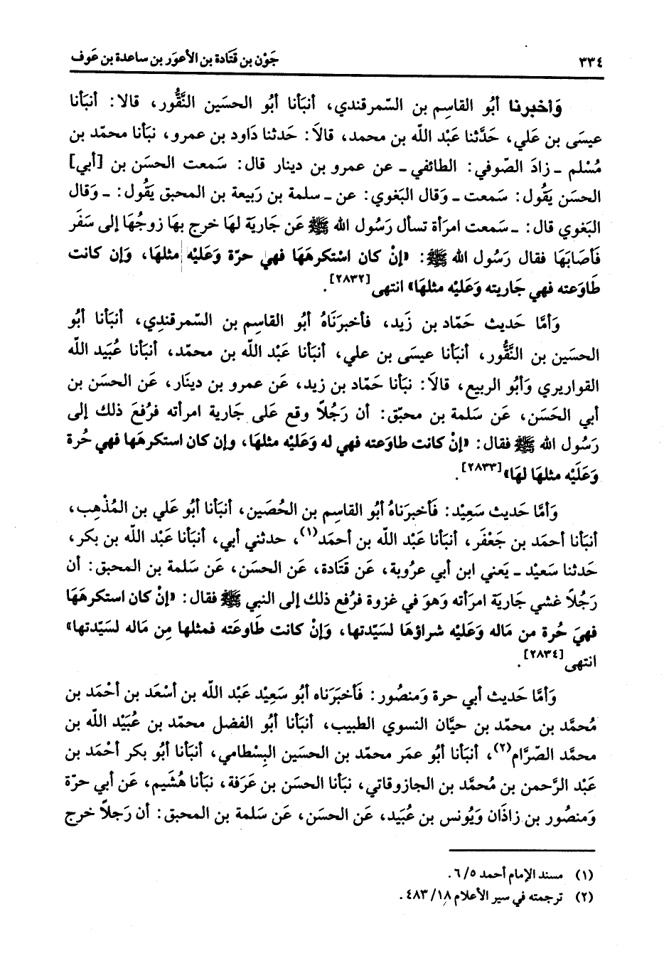 [2834] ح وأما حديث أبي حرة ومنصور فأخبرناه أبو سعيد عبد الله بن أسعد بن أحمد بن محمد بن محمد بن حيان النسوي الطبيب أنبأنا أبو الفضل محمد بن عبيد الله بن محمد الصرام (2) أنبأنا أبو عمر محمد بن الحسين البسطامي أنبأنا أبو بكر أحمد بن عبد الرحمن بن محمد بن الجازوقاني نبأنا الحسن بن عرفة نبأنا هشيم عن أبي حرة ومنصور بن زاذان ويونس بن عبيد عن الحسن عن سلمة بن المحبق أن رجلا خرج