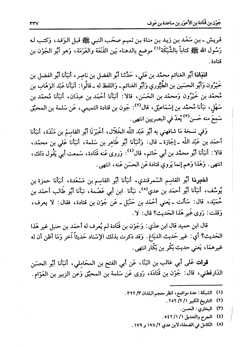 قريش بن سعد بن زيد بن مناة بن تميم صحب النبي (صلى الله عليه وسلم) قبل الوفد وكتب له رسول الله (صلى الله عليه وسلم) كتابا بالشبكة (1) موضع بالدهناء بين القنعة والعرمة وهو أبو الجون بن قتادة أنبأنا أبو الغنائم محمد بن علي حدثنا أبو الفضل بن ناصر أنبأنا أبو الفضل بن خيرون وأبو الحسين بن الطيوري وأبو الغنائم واللفظ له قالوا أنبأنا عبد الوهاب بن محمد بن خيرون ومحمد بن الحسن قالا أنبأنا أحمد بن عبدان أنبأنا محمد بن سهل نبأنا محمد بن إسماعيل قال (2) جون بن قتادة التميمي عن سلمة بن المحبق سمع منه حسن (3) يعد في البصريين انتهى وفي نسخة ما شافهني به أبو عبد الله الخلال أخبرنا أبو القاسم بن مندة أنبأنا أحمد بن عبد الله إجازة قال وأنبأنا أبو طاهر بن سلمة أنبأنا علي بن محمد قالا أنبأنا أبو محمد بن أبي حاتم قال (4) وروى عنه قتادة سمعت أبي يقول ذلك انتهى وهذا وهم إنما يروي قتادة عن الحسن عنه انتهى أخبرنا أبو القاسم السمرقندي أنبأنا أبو القاسم بن مسعدة أنبأنا حمزة بن يوسف أنبأنا أبو أحمد بن عدي (5) نبأنا ابن أبي عصمة نبأنا أبو طالب أحمد بن حميد قال سألت يعني أحمد بن حنبل عن جون بن قتادة فقال لا يعرف وقلت روى غير هذا الحديث قال لا قال ابن حميد قال ابن عدي وجون بن قتادة لم يعرف له أحمد بن حنبل غير هذا الحديث أي غير حديث الدباغ وقد ذكرت بذلك الإسناد حديثا آخر وما أظن أن له غيرهما يعني حديث بكر بن بكار انتهى قرأت على أبي غالب بن البنا عن أبي الفتح بن المحاملي أنبأنا أبو الحسن الدارقطني قال جون بن قتادة روى عن سلمة بن المحبق وعن الزبير بن العوام