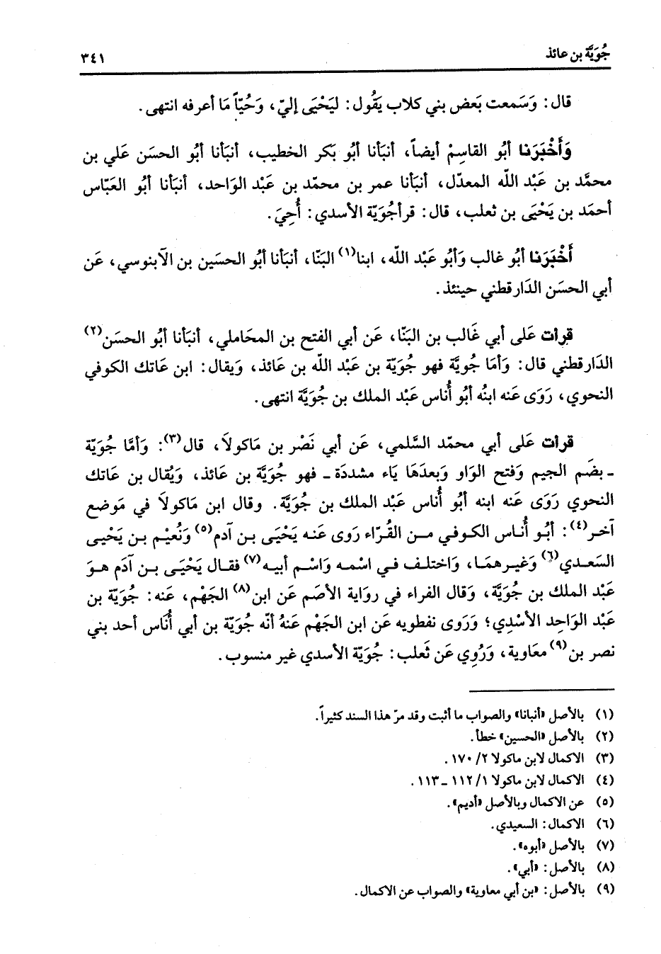 قال وسمعت بعض بني كلاب يقول ليحيى إلي وحيا ما أعرفه انتهى وأخبرنا أبو القاسم أيضا أنبأنا أبو بكر الخطيب أنبأنا أبو الحسن علي بن محمد بن عبد الله المعدل أنبأنا عمر بن محمد بن عبد الواحد أنبأنا أبو العباس أحمد بن يحيى بن ثعلب قال قرأ جوية الأسدي أحي أخبرنا أبو غالب وأبو عبد الله ابنا (1) البنا أنبأنا أبو الحسين بن الآبنوسي عن أبي الحسن الدارقطني حينئذ قرأت على أبي غالب بن البنا عن أبي الفتح بن المحاملي أنبأنا أبو الحسن (2) الدارقطني قال وأما جوية فهو جوية بن عبد الله بن عائذ ويقال ابن عاتك الكوفي النحوي روى عنه ابنه أبو أناس عبد الملك بن جوية انتهى قرأت على أبي محمد السلمي عن أبي نصر بن ماكولا قال (3) وأما جوية بضم الجيم وفتح الواو وبعدها ياء مشددة فهو جوية بن عائذ ويقال بن عاتك النحوي روى عن ابنه أبو أناس عبد الملك بن جوية وقال ابن ماكولا في موضع آخر (4) أبو أناس الكوفي من القراء روى عنه يحيى بن آدم (5) ونعيم بن يحيى السعدي (6) وغيرهما واختلف في اسمه واسم أبيه (7) فقال يحي بن آدم هو عبد الملك بن جوية وقال الفراء في رواية الأصم عن ابن (8) الجهم عنه جوية بن عبد الواحد الأسدي وروى نفطويه عن ابن الجهم عنه أنه جويبن أبي أناس أحد بني نصر بن (9) معاوية وروي عن ثعلب جوية الأسدي غير منسوب
