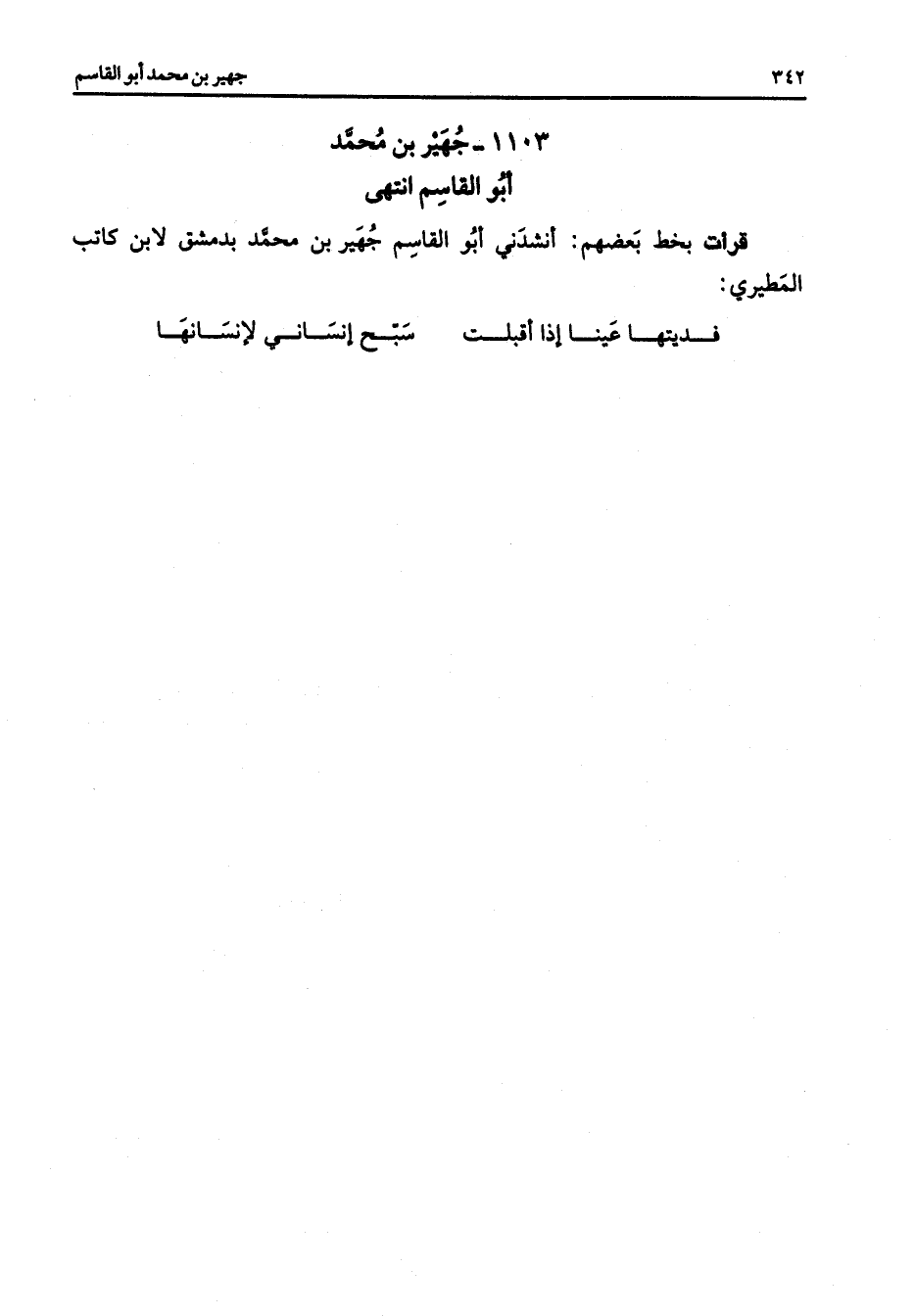 1103 - جهير بن محمد أبو القاسم انتهى قرأت بخط بعضهم أنشدني أبو القاسم جهير بن محمد بدمشق لابن كاتب المطيري فديتها عينا إذا أقبلت * سبح إنساني لإنسانها * "