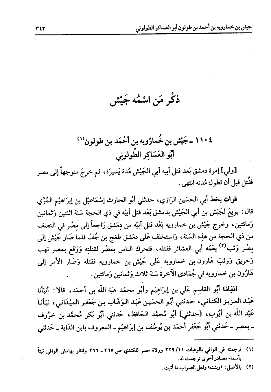 1104 - جيش بن خمارويه بن أحمد بن طولون (1) أبو العساكر الطولوني ولي امرة دمشق بعد قتل أبيه أبي الجيش مدة يسيرة ثم خرج متوجها إلى مصر فقتل قبل أن تطول مدته انتهى قرأت بخط أبي الحسين الرازي حدثني أبو الحارث إسماعيل بن إبراهيم المري قال بويع لجيش بن أبيه الجيش بدمشق بعد أن قتل أبي في ذي الحجة سنة اثنتين وثمانين ومائتين وخرج جيش بن خماروية بعد قتل أبيه من دمشق راجعا إلى مصر في النصف من ذي الحجة من هذه السنة واستخلف على دمشق طغج بن جف فلما صار جيش إلى مصر وثب (2) بعمه أبي العشائر لقتله فتحرك الناس بمصر لقتله ووقع بمصر نهب وحريق ووثب هارون بن خماروية فقتله وصار الأمر إلى هارون بن خماروية على جيش بن خماروية في جمادى الآخرة سنة ثلاث وثمانين ومائتين أنبأنا أبو القاسم علي بن إبراهيم وأبو محمد هبة الله بن أحمد قالا أنبأنا عبد العزيز الكتاني حدثني أبو الحسين عبد الوهاب بن جعفر الميداني نبأنا عبد الله بن أيوب حدثني أبو محمد الحافظ حدثني أبو بكر محمد بن خروف بمصر حدثني أبو جعفر أحمد بن يوسف بن إبراهيم المعروف بابن الداية حدثني