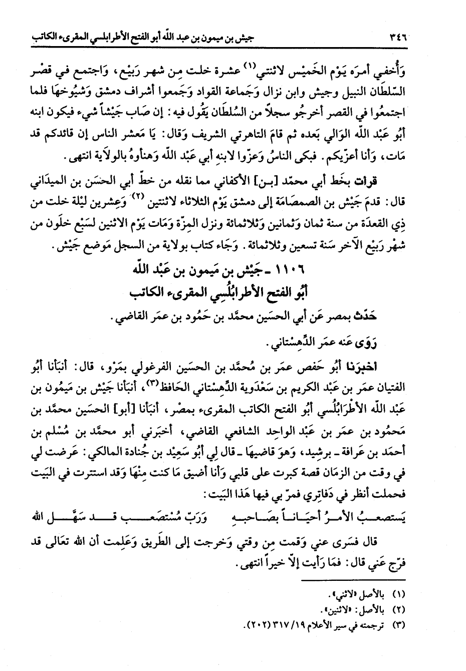 وأخفي أمره يوم الخميس لاثنتي (1) عشرة خلت من شهر ربيع واجتمع في قصر السلطان النبيل وجيش وابن نزال وجماعة القواد وجمعوا أشراف دمشق وشيوخها فلما اجتمعوا في القصر أخرجو سجلا من السلطان يقول فيه إن صاب جيشا شئ فيكون ابنه أبو عبد الله الوالي بعده ثم قام التاهرتي الشريف وقال يا معشر الناس إن قائدكم قد مات وأنا أعزيكم فبكى الناس وعزوا لابنه أبي عبد الله وهناؤه بالولاية انتهى قرأت بخط أبي محمد بن الأكفاني مما نقله من خط أبي الحسن بن الميداني قال قدم جيش بن الصمصامة إلى دمشق يوم الثلاثاء لاثنتين (2) وعشرين ليلة خلت من ذي القعدة من سنة ثمان وثمانين وثلاثمائة ونزل المزة ومات يوم الأثنين لسبع خلون من شهر ربيع الآخر سنة تسعين وثلاثمائة وجاء كتاب بولاية من السجل موضع جيش 1106 جيش بن ميمون بن عبد الله أبو الفتح الأطرابلسي المقرئ الكاتب حدث بمصر عن أبي الحسين محمد بن حمود بن عمر القاضي روى عنه عمر الدهستاني أخبرنا أبو حفص عمر بن محمد بن الحسين الفرغولي بمرو قال أنبأنا أبو الفتيان عمر بن عبد الكريم بن سعدوية الدهستاني الحافظ (3) أنبأنا جيش بن ميمون بن عبد الله الأطرابلسي أبو الفتح الكاتب المقرئ بمصر أنبأنا أبو الحسين محمد بن محمود بن عرم بن عبد الواحد الشافعي القاضي أخبرني أبو محمد بن مسلم بن أحمد بن عرافة برشيد وهو قاضيها قال لي أبو سعد بن جنادة المالكي عرضت لي في وقت من الزمان قصة كبرت على قلبي وأنا أضيق ما كنت منها وقد استترت في البيت فحملت أنظر في دفاتري فمر فيها هذا البيت * يستصعب الأمر أحيانا بصاحبه * ورب مستصعب قد سهل الله * قال فسرى عني وقمت من وقتي وخرجت إلى الطريق وعملت أن لله تعالى قد فرج عني قال فما رأيت إلا خيرا انتهى "
