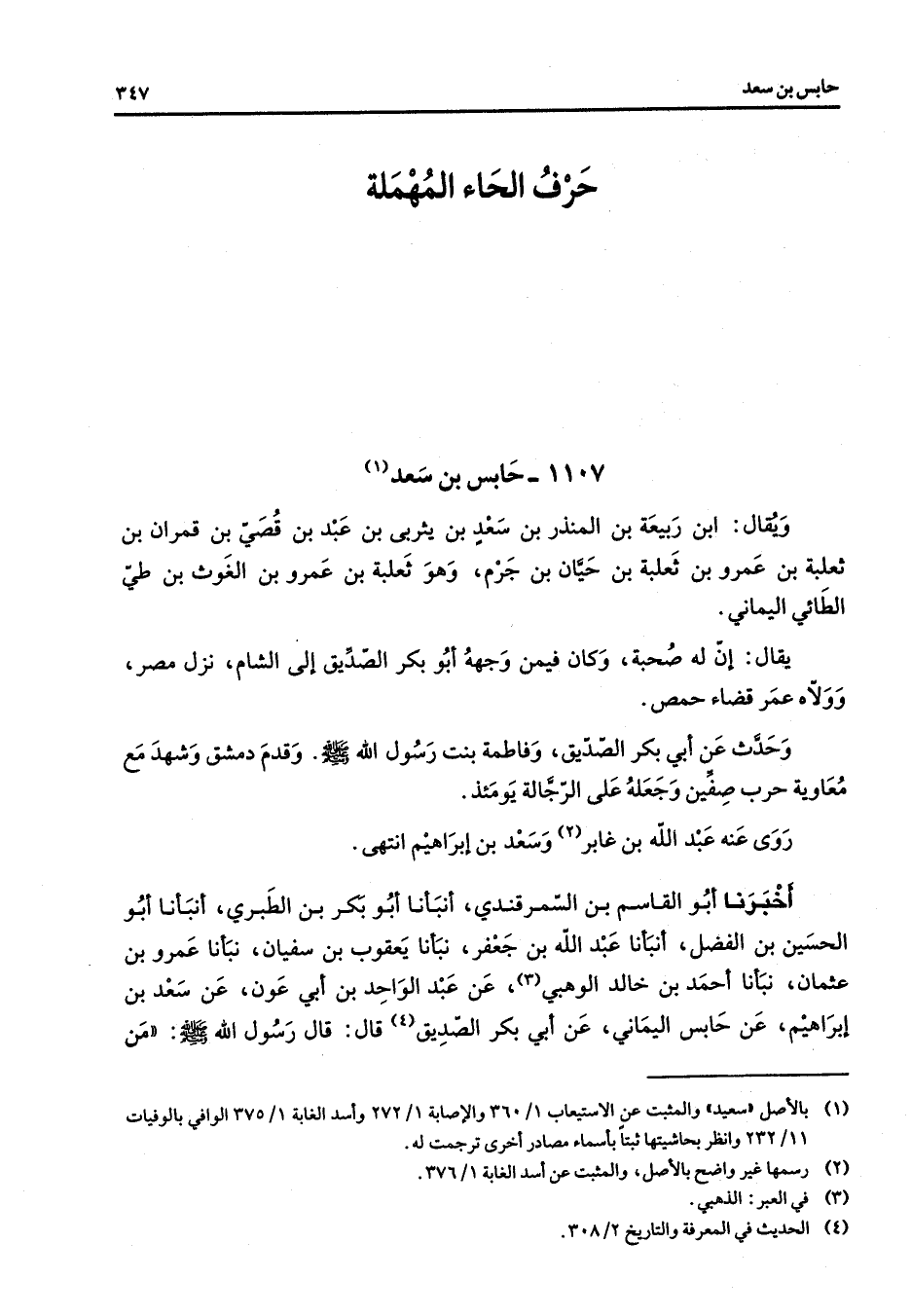 1107 - حابس بن سعد (1) ويقال ابن ربيعة بن المنذر بن سعد بن يثربي بن عبد بن قصي بن قمران بن ثعلبة بن عمرو بن ثعلبة بن حيان بن جرم وهو ثعلبة بن عمرو بن الغوث بن طي الطائي اليماني يقال إن له صحبة وكان فيمن وجهه أبو بكر الصديق إلى الشام نزل مصر وولاه عمر قضاء حمص وحدث عن أبي بكر الصديق وفاطمة بنت رسول الله (صلى الله عليه وسلم) وقدم دمشق وشهد مع معاوية حرب صفين وجعله على الرجالة يومئذ روى عنه عبد الله بن غابر (2) وسعد بن إبراهيم انتهى أخبرنا أبو القاسم بن السمرقندي أنبأنا أبو بكر بن الطبري أنبأنا أبو الحسين بن الفضل أنبأنا عبد الله بن جعفر نبأنا يعقوب بن سفيان نبأنا عمرو بن عثمان نبأنا أحمد بن خالد الوهبي (3) عن عبد الواحد بن أبي عون عن سعد بن إبراهيم عن حابس اليماني عن أبي بكر الصديق (4) قال قال رسول الله (صلى الله عليه وسلم) من