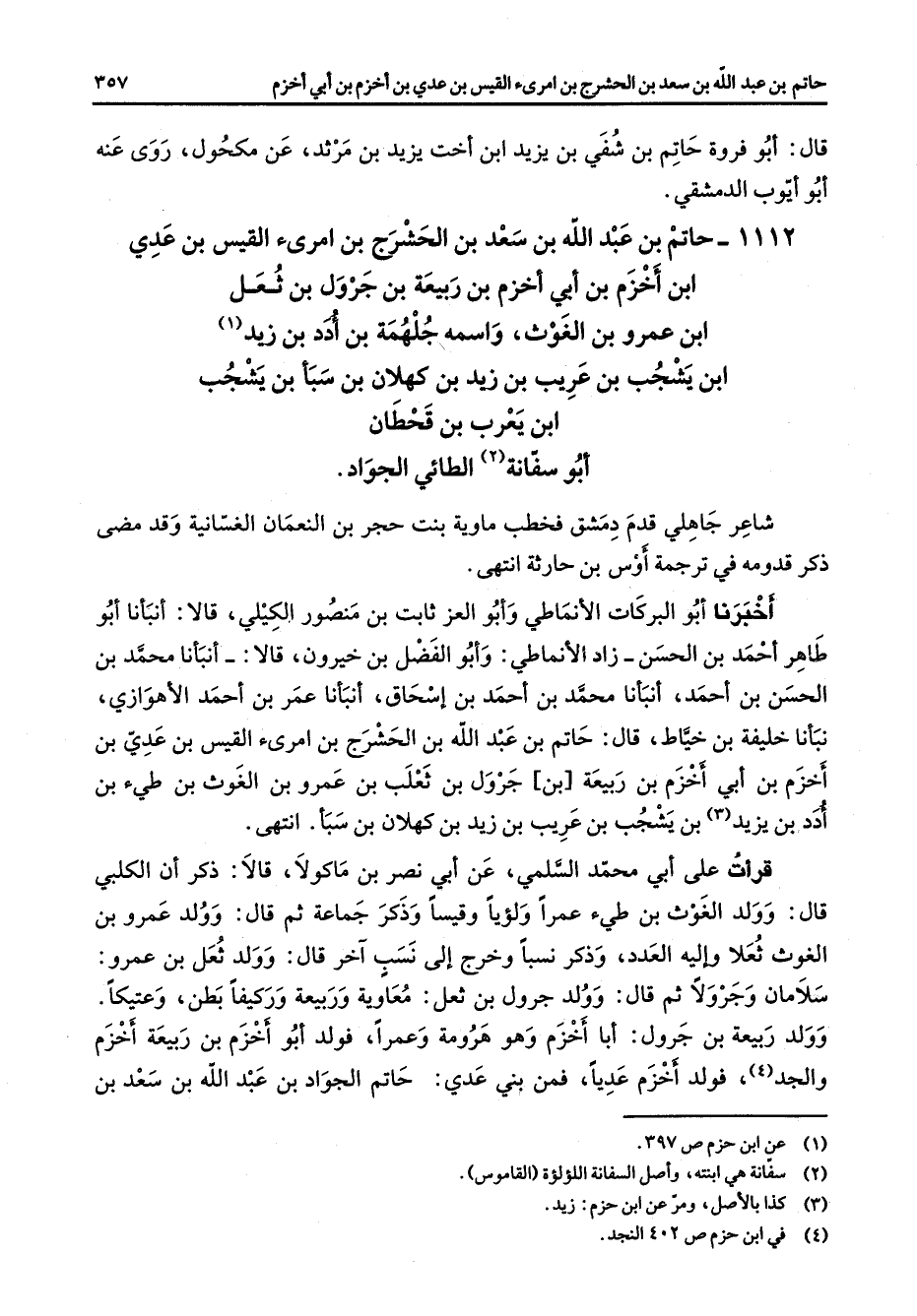 قال أبو فروة حاتم بن شفي بن يزيد ابن أخت يزيد بن مرثد عن مكحول روى عنه أبو أيوب الدمشقي ح 1112 اتم بن عبد الله بن سعد بن الحشرج بن أمرئ القيس بن عدي ابن أخزم بن أبي أخزم بن ربيعة بن جرول بن ثعل ابن عمرو بن الغوث واسمه جلهمة بن أدد بن زيد ابن يشجب بن عريب بن زيد بن كهلان بن سبأ بن يشجب ابن يعرب بن قحطان أبو سفانة (2) الطائي الجواد شاعر جاهلي قدم دمشق فخطب ماوية بنت حجر بن النعمان الغسانية وقد مضى ذكر قدومه في ترجمة أوس بن حارثة انتهى أخبرنا أبو البركات الأنماطي وأبو العز ثابت بن منصور الكيلي قالا أنبانا أبو طاهر أحمد بن الحسن زاد الأنماطي وأبو الفضل بن خيرون قالا أنبانا محمد بن الحسن بن أحمد أنبأنا محمد بن أحمد بن إسحاق أنبأنا عمر بن أحمد الأهوازي نبأنا خليفة بن خياط قال حاتم بن عبد الله بن الحشرج بن أمرئ القيس بن عدي بن أخزم بن أبي أخزم بن ربيعة بن جرول بن ثعلب بن عمرو بن الغوث بن طئ بن أدد بن يزيد (3) بن يشجب بن عريب ببن زيد بن كهلان بن سبأ انتهى قرأت على أبي محمد السلمي عن أبي نصر ماكولا قالا ذكر أن الكلبي قال وولد الغوث بن طئ عمرا ولؤيا وقيسا وذكر جماعة ثم قال وولد عمرو بن الغوث ثعلا وإليه العدد وذكر نسبا وخرج إلى نسب آخر قال وولد ثعل بن عمرو سلامان وجرولا ثم قال وولد جرول بن ثعل معاوية وربيعة وركيفا بطن وعتيكا وولد ربيعة بن جرول أبا أخزم وهو هرومة وعمرا فولد أبو أخزم بن ربيعة أخزم والجد (4) فولد أخزم عديا فمن بني عدي حاتم الجواد بن عبد الله بن سعد بن