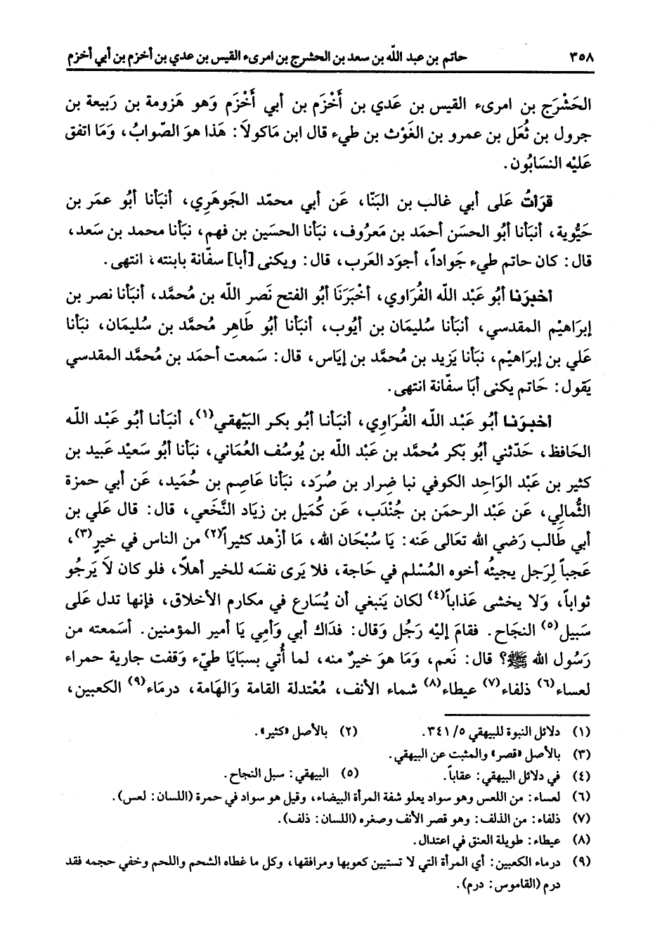 الحشرج بن امرئ القيس بن عدي بن أخزم بن أبي أخزم وهو هزومة بن ربيعة بن جرول بن ثعل بن عمرو بن الغوث بن طئ قال ابن ماكولا هذا هو الصواب وما اتفق عليه النسابون قرأت على أبي غالب بن البنا عن أبي محمد الجوهري أنبأنا أبو عمر بن حيوية أنبأنا أبو الحسن أحمد بن معروف نبأنا الحسين بن الفهم نبأنا محمد بن سعد قال كان حاتم طئ جوادا أجود العرب قال ويكنى أبا سفانة بابنته انتهى أخبرنا أبو عبد الله الفراوي أخبرنا أبو الفتح نصر الله بن محمد أنبأنا نصر بن إبراهيم المقدسي أنبأنا سليمان بن أيوب أنبأنا أبو طاهر محمد بن سليمان نبأنا علي بن إبراهيم نبأنا يزيد بن محمد بن إياس قال سمعت أحمد بن محمد المقدسي يقول حاتم يكنى أبا سفانة انتهى أخبرنا أبو عبد الله الفراوي أنبأنا أبو بكر البيهقي (1) أنبأنا أبو عبد الله الحافظ حدثني أبو بكر محمد بن عبد الله بن يوسف العماني نبأنا أبو سعيد عبيد بن كثير بن عبد الواحد الكوفي نبا ضرار بن صرد نبأنا عاصم بن حميد عن أبي حمزة الثمالي عن عبد الرحمن بن جندب عن كميل بن زياد النخعي قال قال علي بن أبي طالب رضي الله تعالى عنه يا سبحان الله ما أزهد كثيرا (2) من الناس في خير (3) عجبا لرجل يجيئه أخوه المسلم في حاجة فلا يرى نفسه للخير أهلا فلو كان لا يرجو ثوابا ولا يخشى عذابا (4) لكان ينبغي أن يسارع في مكارم الأخلاق فإنها تدل على سبيل (5) النجاح فقام إليه رجل وقال فداك أبي وأمي يا أمير المؤمنين أسمعته من رسول الله (صلى الله عليه وسلم) قال نعم وما هو خير منه لما أتي بسبايا طئ وقفت جارية حمراء لعساء (6) ذلفاء (7) عيطاء (8) شماء الأنف معتدلة القامة والهامة درماء (9) الكعبين