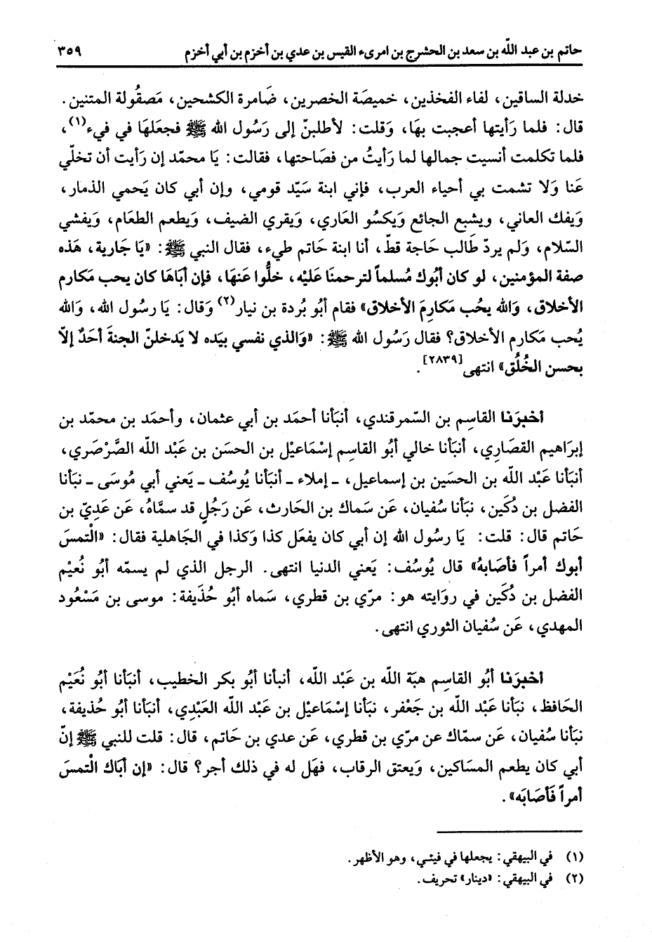 خذلة الساقين لفاء الفخذين خميصة الخصرين ضامرة الكشحين مصقولة المتنين قال فلما رأيتها أعجبت بها وقلت لأطلبن إلى رسول الله (صلى الله عليه وسلم) فجعلها في فئ (1) فلما تكلمت أنسيت جمالها لما رأيت من فصاحتها فقالت يا محمد إن رأيت أن تخلي عنا وتشمت بي أحياء العرب فإني ابنة سيد قومي وإن أبي كان يحمي الذمار ويفك العاني ويشبع الجائع ويكسو العاري ويقري الضيف ويطعم الطعام ويفشي السلام ولم يرد طالب حاجة قط أنا ابنة حاتم طئ فقال النبي (صلى الله عليه وسلم) يا جارية هذه صفة المؤمنين لو كان أبوك مسلما لترحمنا عليه خلوا عنها فإن أباها كان يحب مكارم الأخلاق والله يحب مكارم الأخلاق ح فقام أبو بردة بن نيار (2) وقال يا رسول الله والله يحب مكارم الأخلاق فقال رسول الله (صلى الله عليه وسلم) والذي نفسي بيده لا يدخلن الجنة أحد إلا بحسن الخلق ح انتهى
